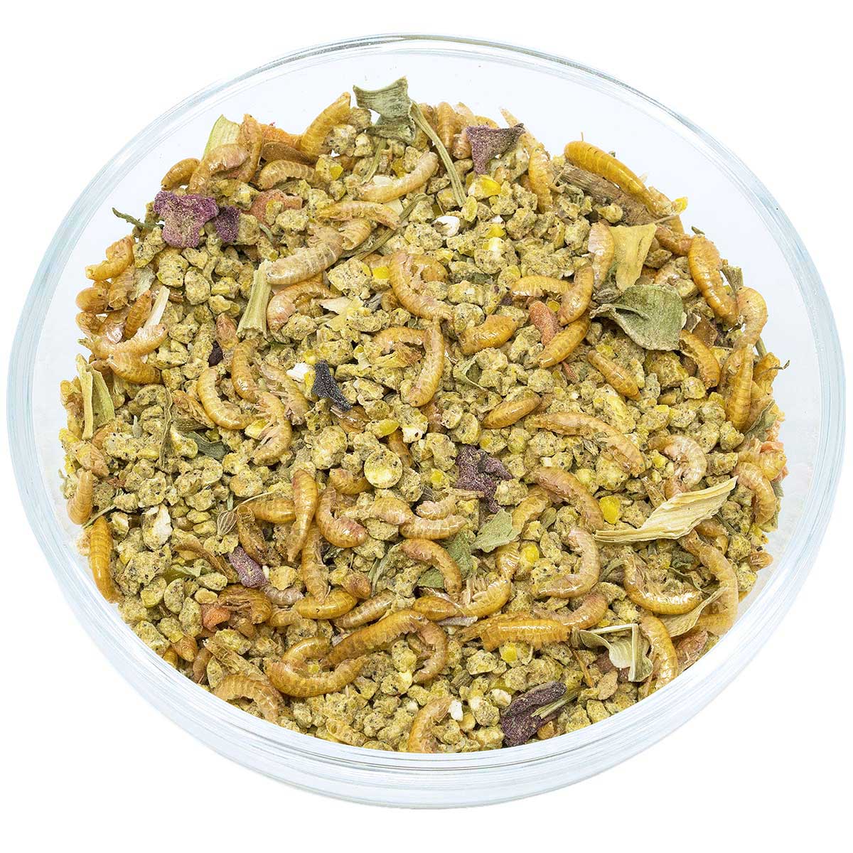 Compoziție: Porumb, grâu, făină de extracție de soia (fasole), cu săpun, din semințe decorticate, încălzită cu abur 1, gammarus, carbonat de calciu, făină de extracție de rapiță cu sămânță, făină de extracție de floarea-soarelui din semințe parțial decorticate, amestec de grăsimi (vegetale), furaje cu gluten de porumb, cubulețe de morcov, pătrunjel uscat, fulgi de praz, sfeclă roșie, fosfat monocalcic, clorură de sodiu, bicarbonat de sodiu, oxid de magneziu, tescovină de mere, anason, rădăcină de nalbă, rădăcină de lemn dulce, cimbru, frunze de cătină, frunze de măceș, iarbă de gălbenele, frunze de mure, hibiscus tocat