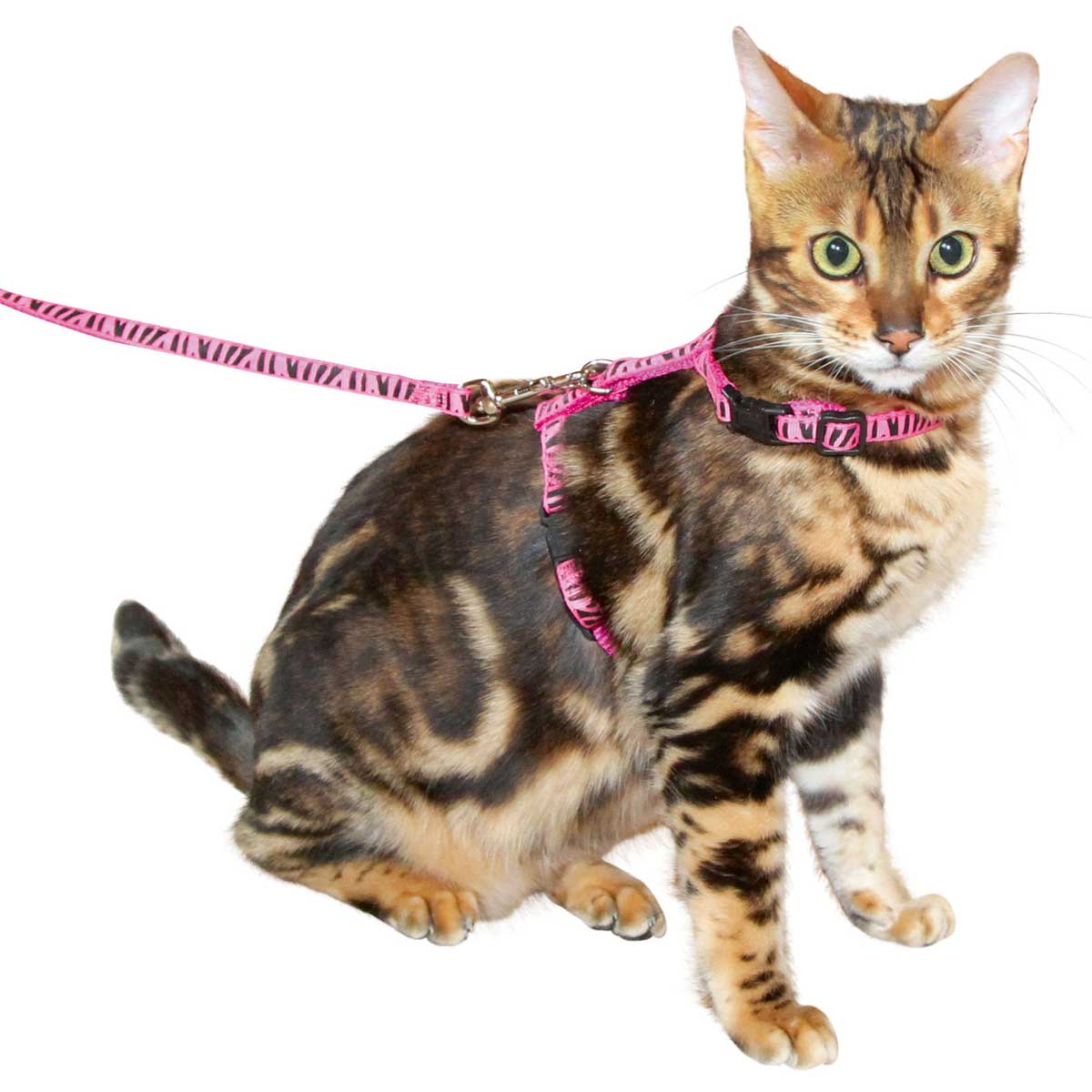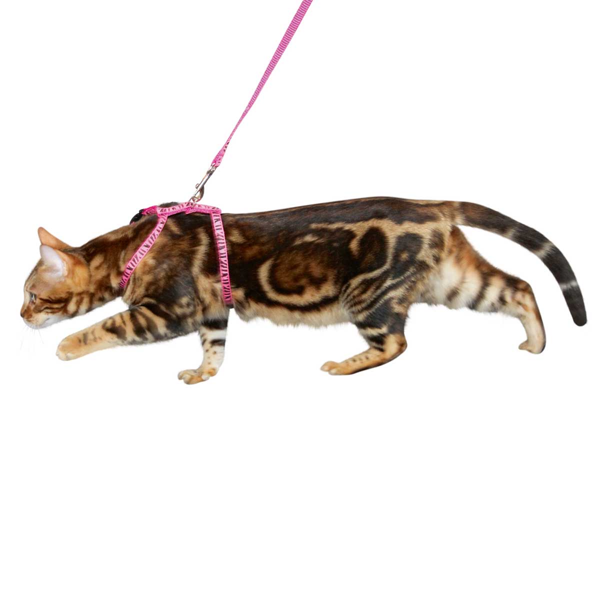 Die pinkfarbene Leine besteht aus Nylon mit einem Zebra- Druck. Das Katzengeschirr wird mit Clickverschlüssen geschlossen. Die leine ist 120 cm lang und 10 mm breit.