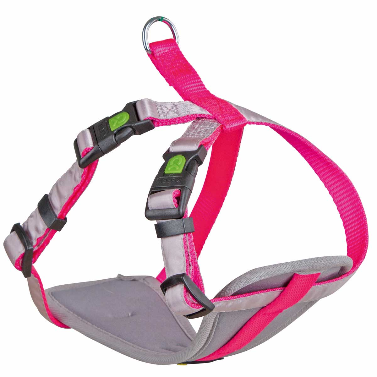 Das Geschirr für kleine Hunde ist aus hochwertigem Nylongewebe gefertigt mit aufgenähter Borte. Der Brustbereich ist ist gepolstert mit Synthesekautschug. Das Hundegeschirr gibt es in zwei verschiedenen Farben ( pink, blau) und ist stufenlos verstellbar.