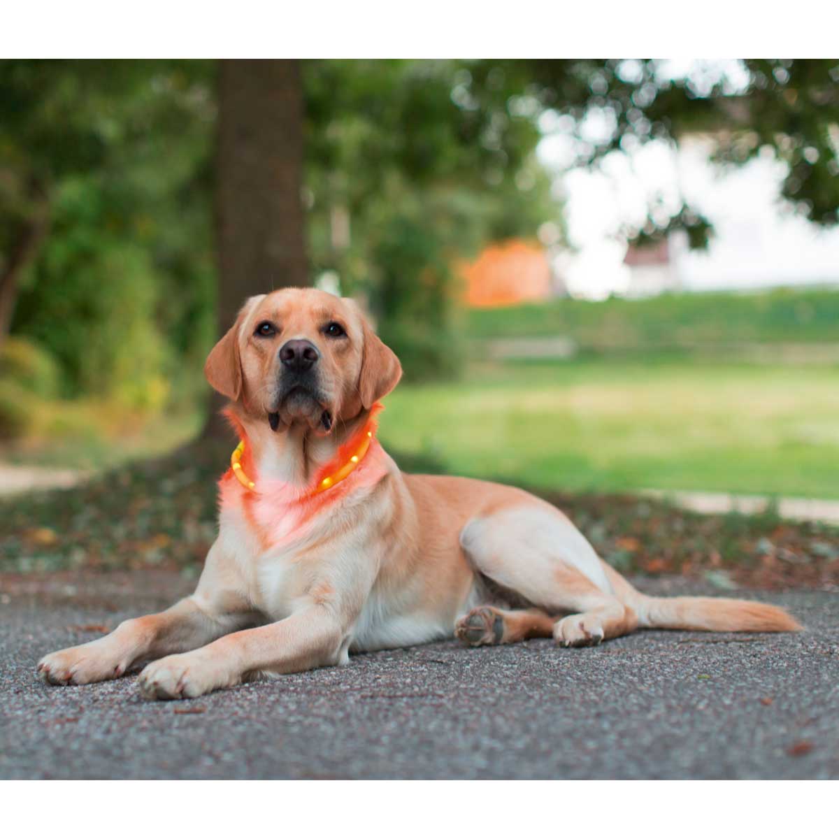 Das LED- Halsband ist individuell kürzbar, wasserfest und bis zu 500 m sichtbar. Man kann zwischen zwei Blinkstufen oder Dauerlicht wählen. Ein aufladbarer Akku ist über das inkludierte USB- Kabel aufladbar.