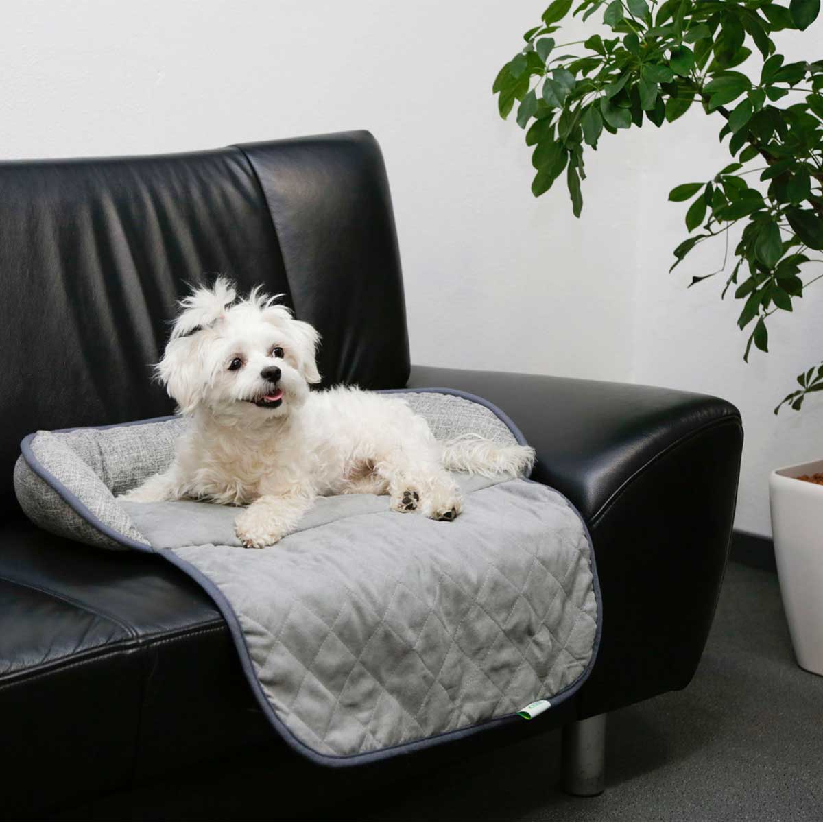 Das Hundekissen Emalia schützt die Couch vor Schmutz und Tierhaaren. Dieses Kissen ist auch als Autobett oder auf Reisen verwendbar.