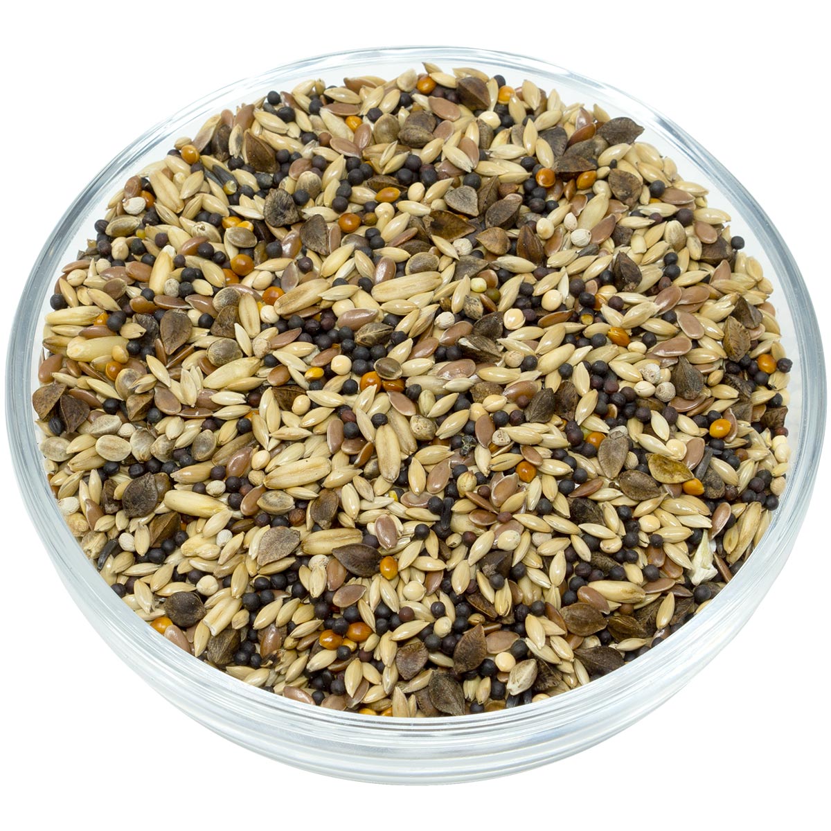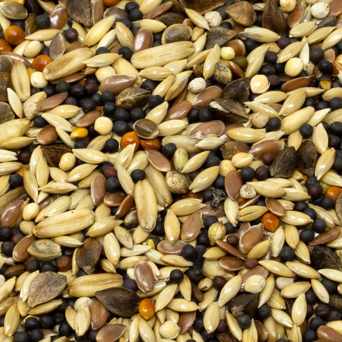 36,00% semințe lucioase, 21,00% nap negru, 14,00% semințe de in, 8,00% hrișcă, 6,00% fulgi de ovăz, 5,00% mei galben, 5,00% mei roșu, 3,00% cânepă europeană, 1,00% semințe de negro, 1,00% semințe de perilla albă.