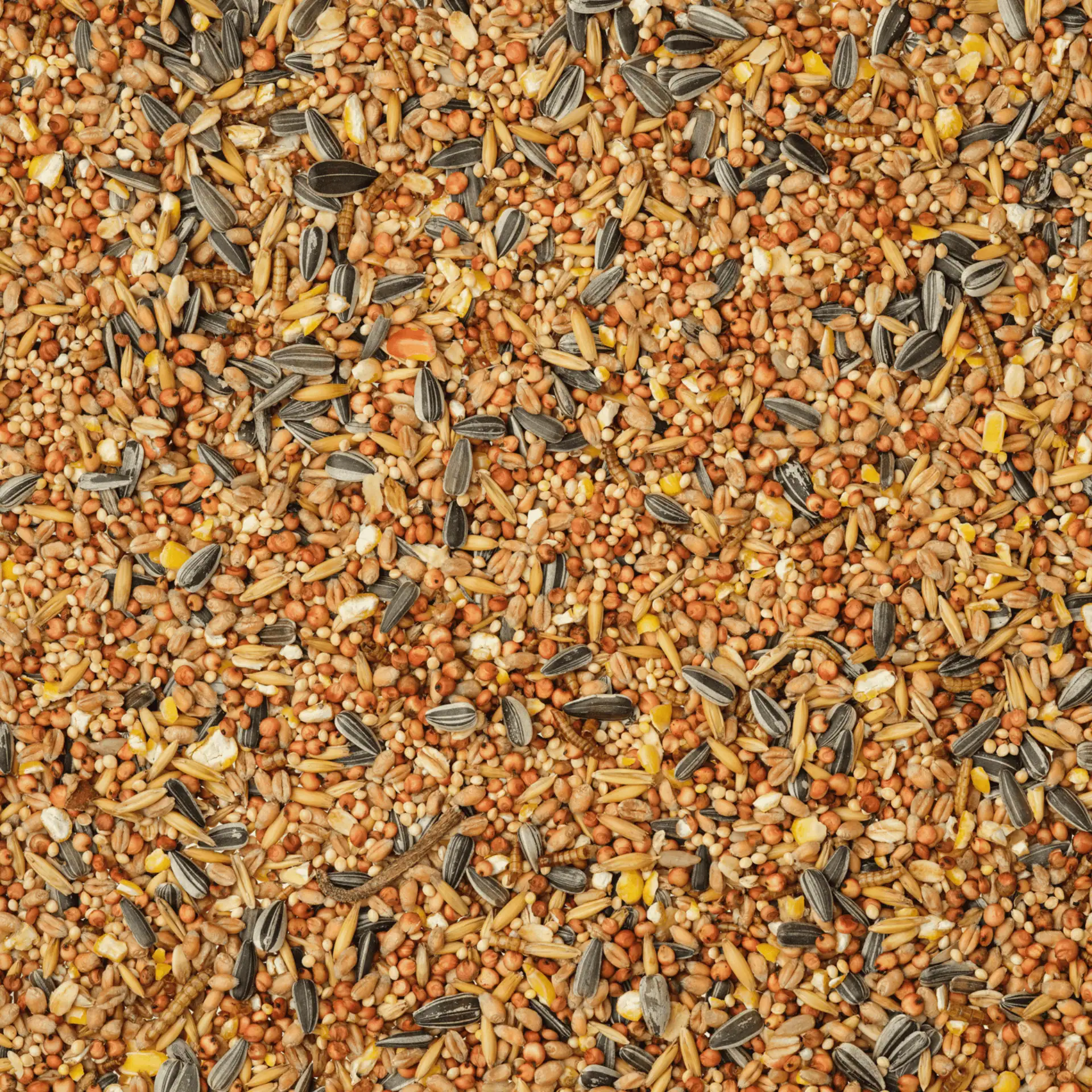 32,00% boabe de mei, 25,00% grâu, 14,00% mei galben, 10,00% semințe negre de floarea-soarelui, 8,00% ovăz, 7,00% porumb măcinat grosier, 2,00% viermi de făină uscați, 2,00% fulgi de ovăz.