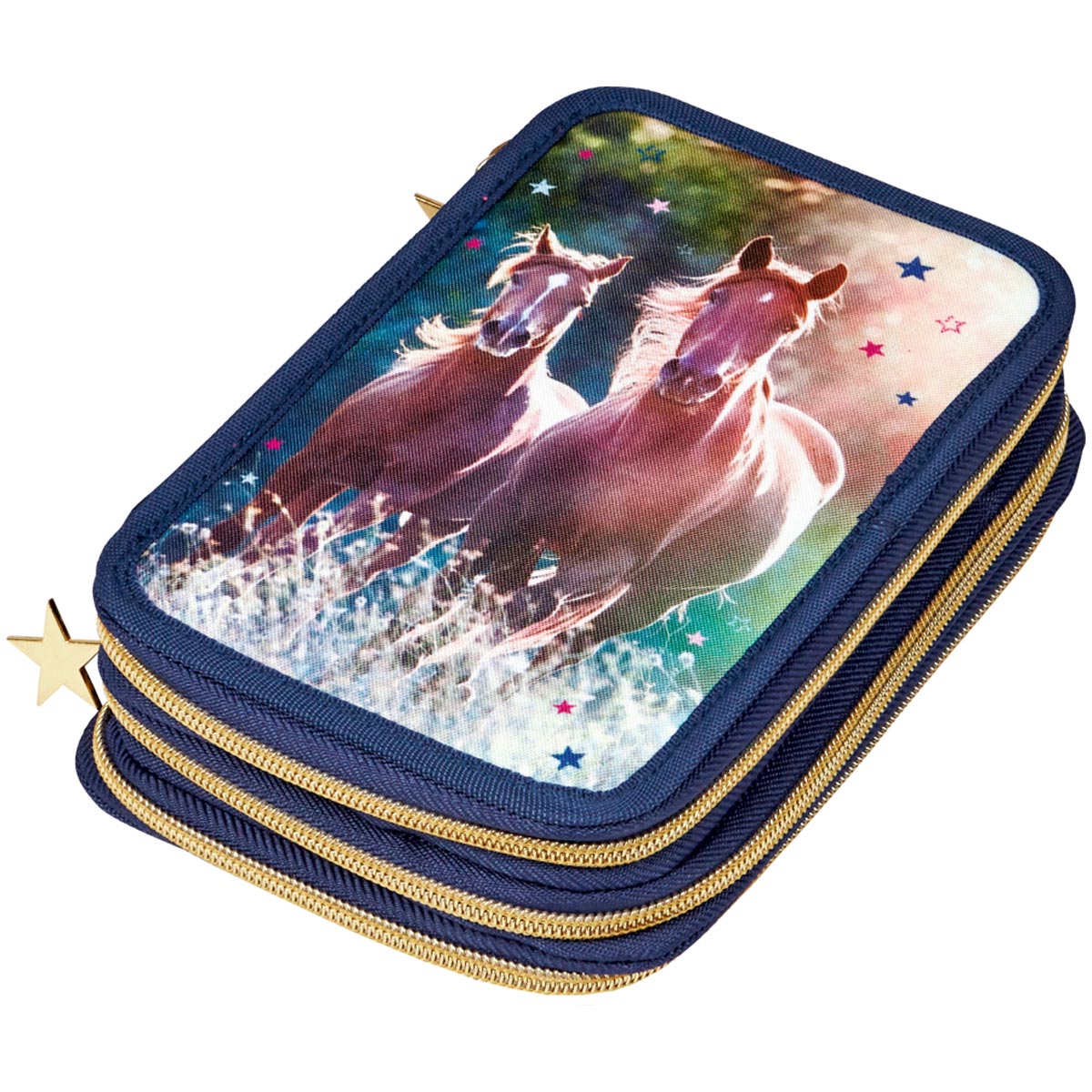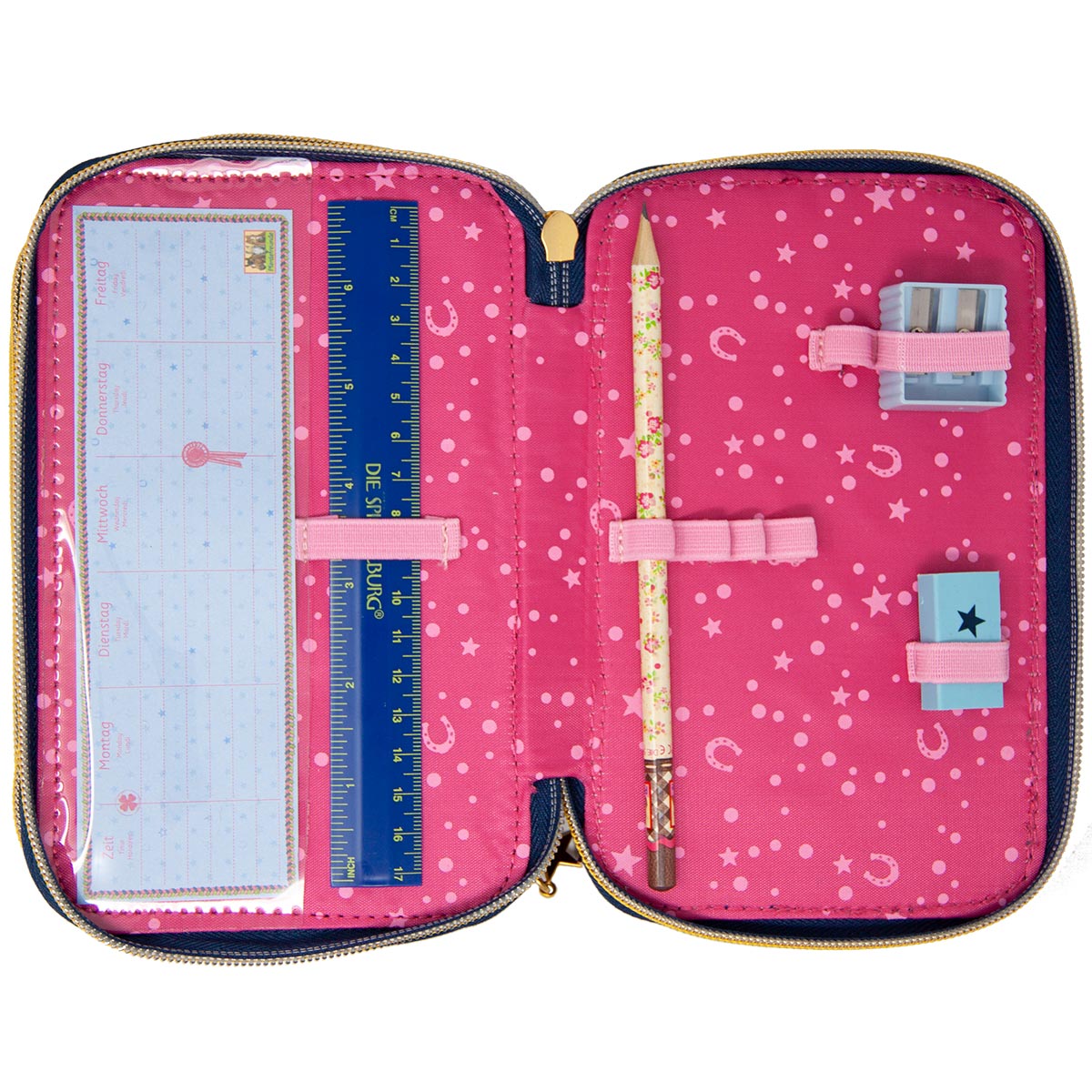 Trusa de creioane cu 3 compartimente a prietenilor cailor este un adevărat economizor de spațiu pentru începutul școlii. Această frumoasă trusă de creion cu cai poate conține tot ce are nevoie micul iubitor de cai. Trusa de creioane de la Die Spiegelburg cu 3 compartimente este deja plină cu un orar, un creion, o riglă, un ascuțitor și o gumă de șters. Penar perfect pentru fetele și iubitorii de cai.