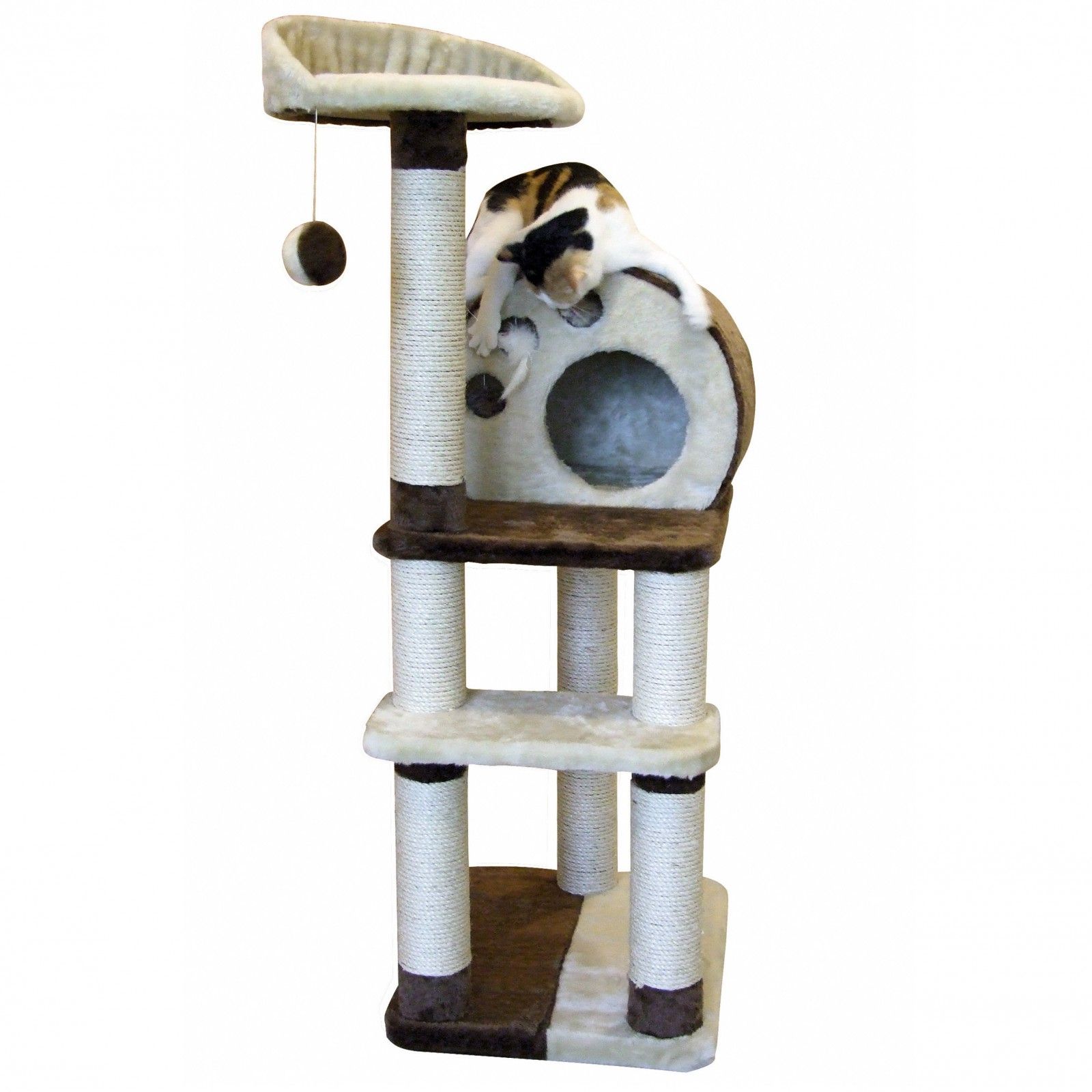 R: Stâlpii de zgâriat sunt confecționați din sisal natural, iar platforma de odihnă este căptușită cu un material moale și plăcut la atingere. Ascunzătoarea este fabricată din materiale rezistente și sigure pentru pisici.