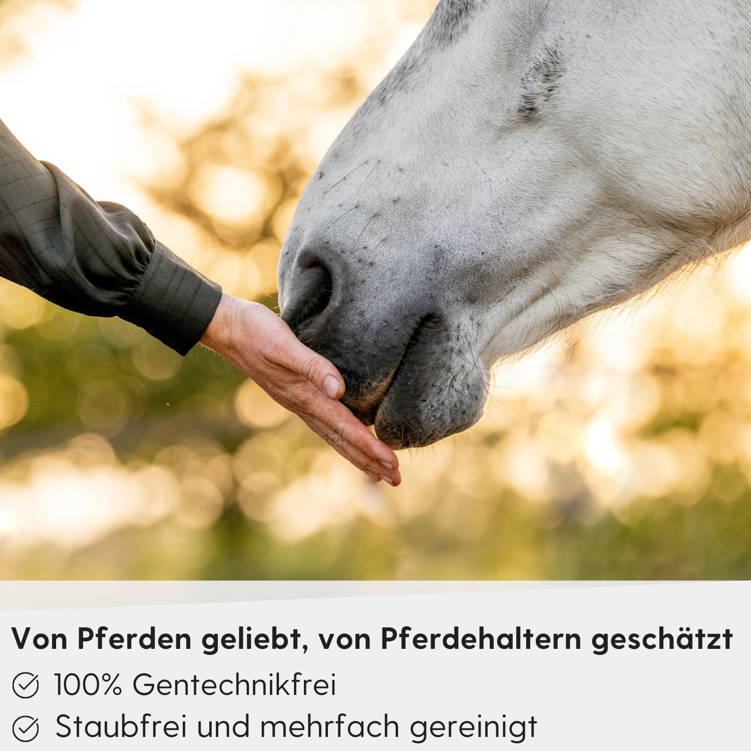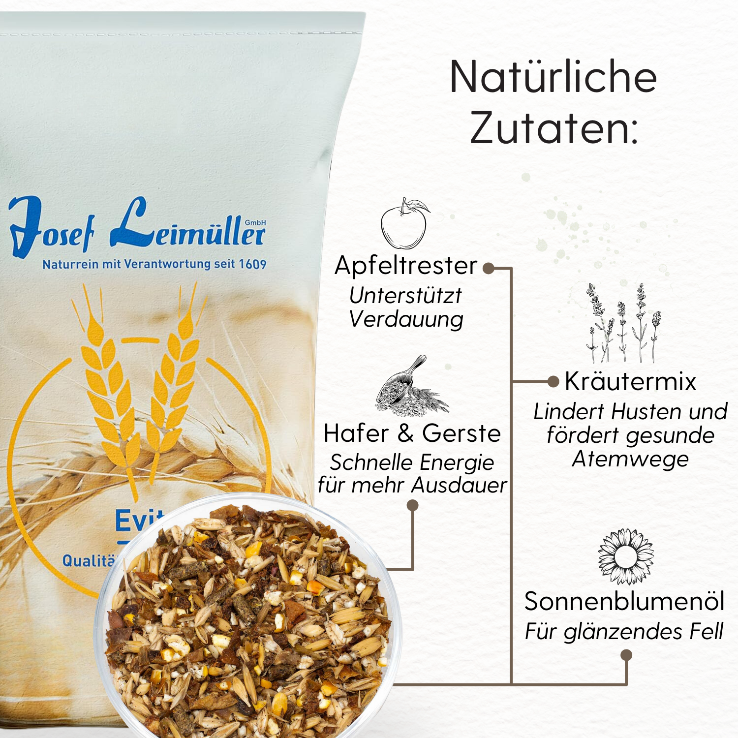 Hrana pentru cai Leimüller este deosebit de ușor de digerat. Hrana este săracă în praf, deoarece conține ulei de floarea-soarelui pur și a fost produsă cu delicatețe și cu cea mai mare grijă în Austria. Garantat fără OMG! Conține un amestec natural de diverse plante și ierburi (împotriva tusei și bun pentru căile respiratorii).