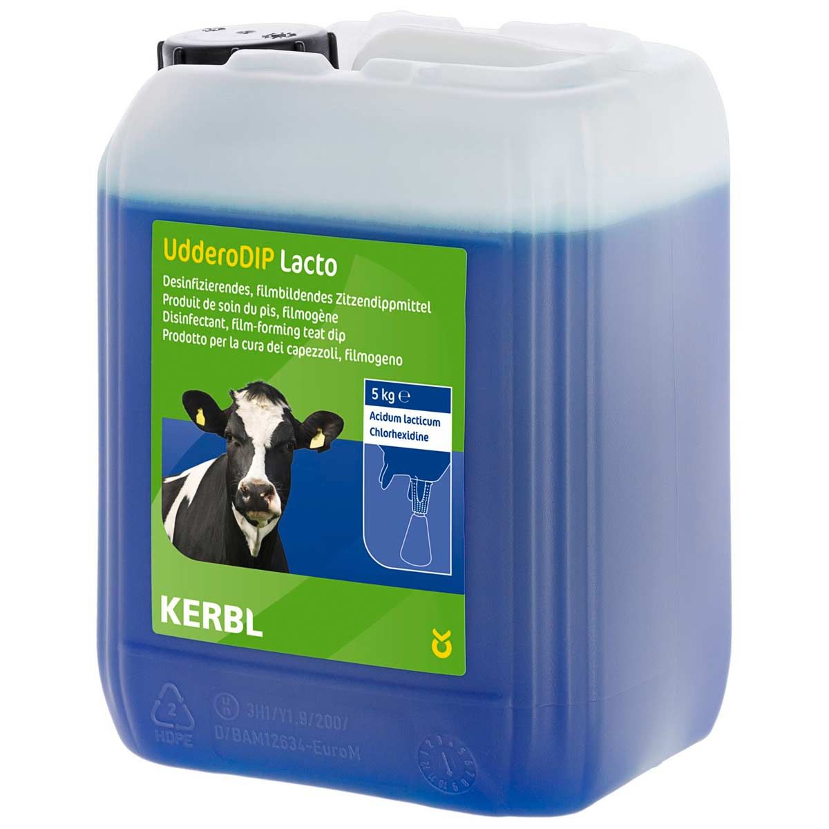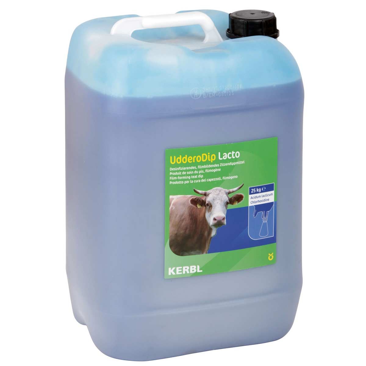 Optim pentru dezinfectarea ugerului: UdderoDip Lacto - un dezinfectant de tetine foarte eficient, fără iod, pe bază de acid lactic și digluconat de clorhexidină.