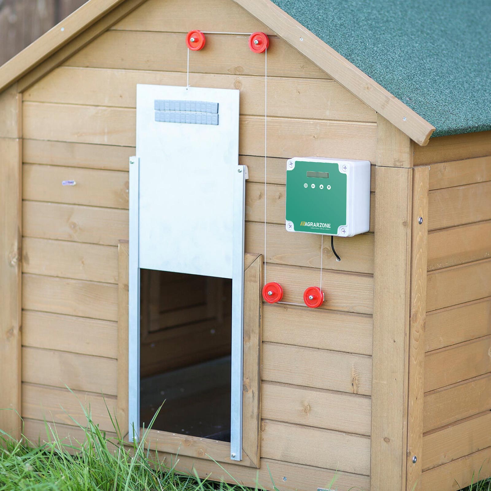 Prin intermediul unui întrerupător, motorul integrat al porții automate pentru ușa de păsări este controlat, realizând astfel deschiderea sau închiderea unui glisor vertical prin tragerea unui cablu. Este posibilă și operarea manuală. Carcasa ușii cu deschidere automată a adăpostului pentru păsări este extrem de stabilă și protejează componentele electronice fine de umiditate, murdărie și lumina soarelui. Plasat într-o poziție ușor protejată, glisorul electronic rezistă foarte mult timp datorită componentelor sale extrem de durabile.