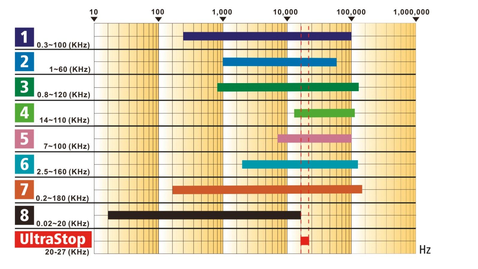 Acest dispozitiv utilizează ultrasunete (20.000 - 27.000 Hz) pentru a respinge șoarecii, șobolanii și alți dăunători pe o rază de 350 m².