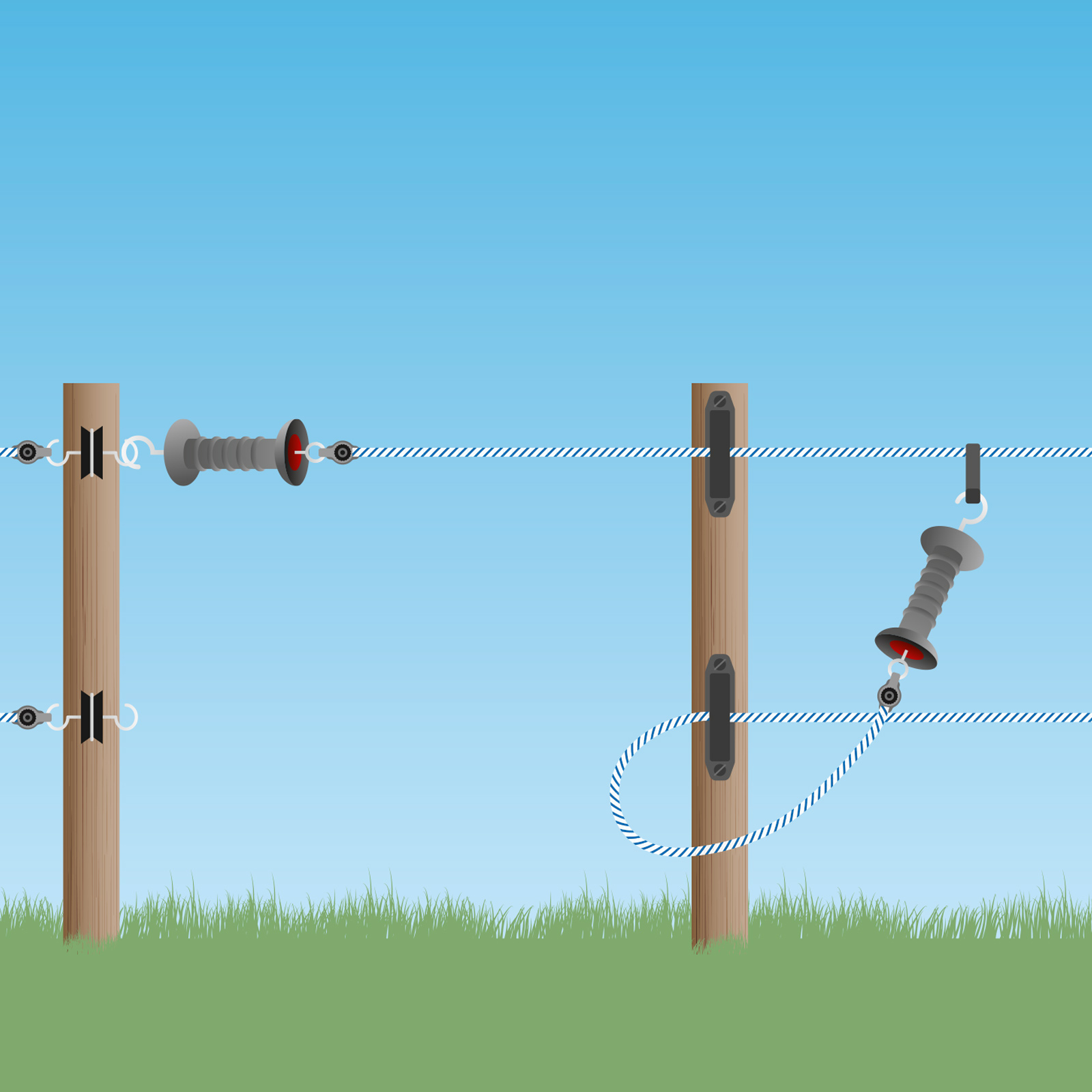 Setul poate fi montat pe orice stâlp de lemn fără prea mult efort. Conexiunea electrică între materialul conductor și mânerul porții sau izolatorul porții se stabilește cu ajutorul șurubului de fixare de pe conectorul rapid al cablului. Șurubul este, de asemenea, excelent pentru strângerea frânghiei. Izolatorii profesioniști pentru frânghii cu inserție de cauciuc electroconductor, incluși în pachetul de livrare, fixează frânghia foarte ușor, dar sigur.