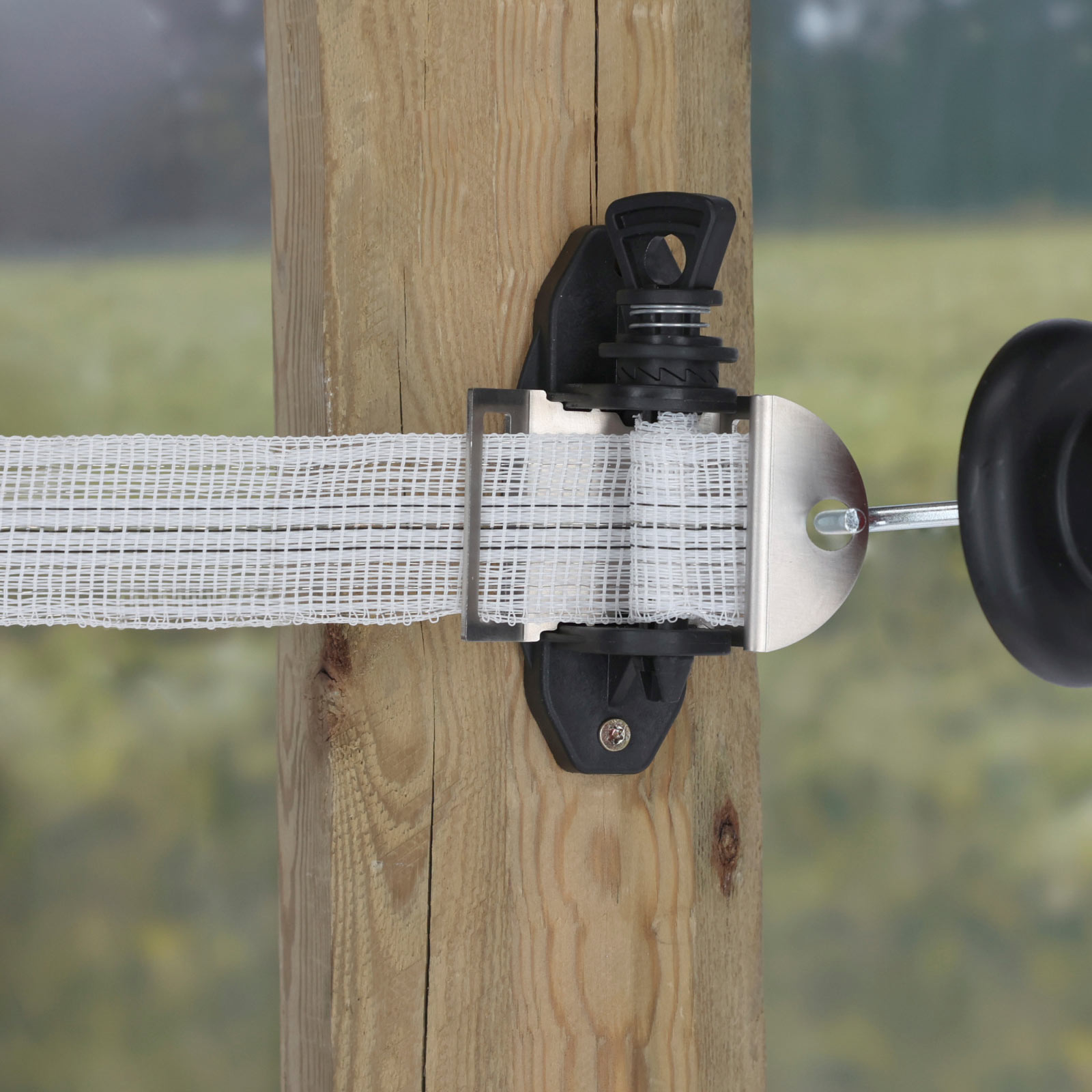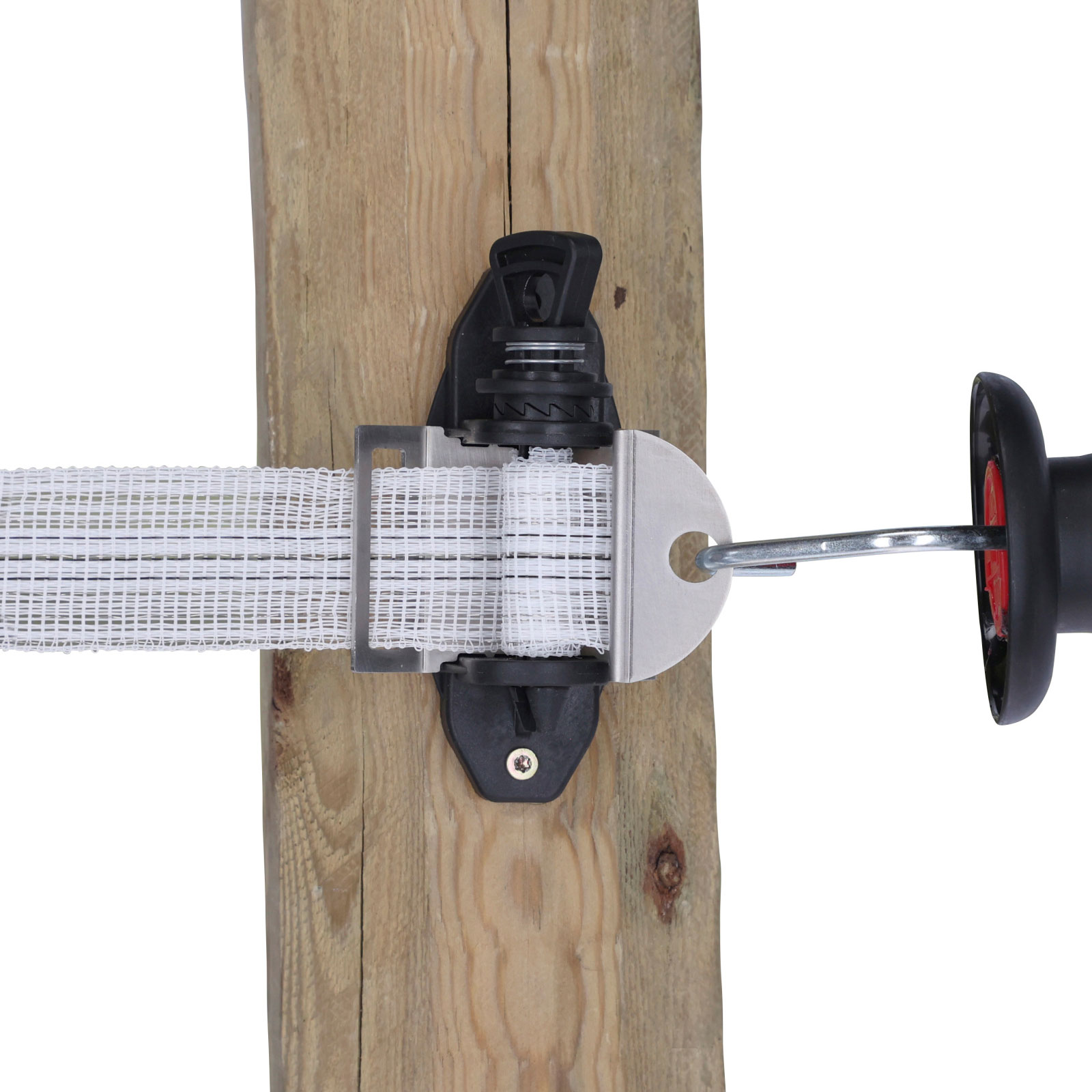 Izolatorul perfect pentru început și sfârșit pentru agățarea mânerelor de poartă și tensionarea simultană a benzilor de gard de pășune cu o lățime de până la 40 mm.