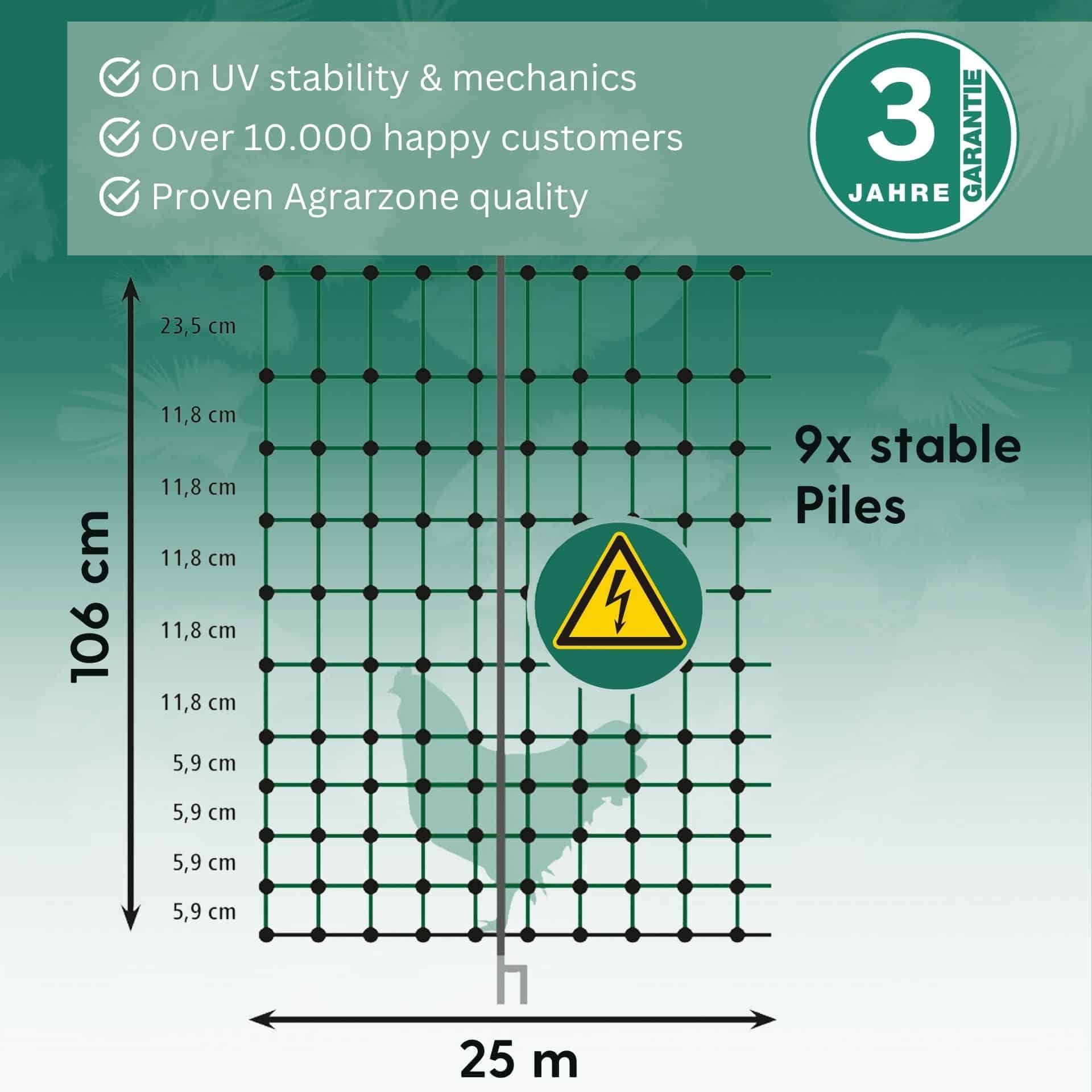Cu plasa de gard pentru păsări Agrarzone, obțineți un produs de top la un preț avantajos! Gardul stabil pentru păsări de curte este ușor de montat, extins și demontat. Gardul electric pentru păsări poate fi extins cu ușurință cu alte plase sau cu o poartă pentru plasele de gard pentru pășuni. Plasa electrificabilă pentru pășuni poate fi montată și demontată în câteva secunde, ceea ce face ca plasa electrică să fie perfectă pentru perioadele scurte de pășunat. Poate fi rulat și depozitat cu ușurință pentru a economisi spațiu.