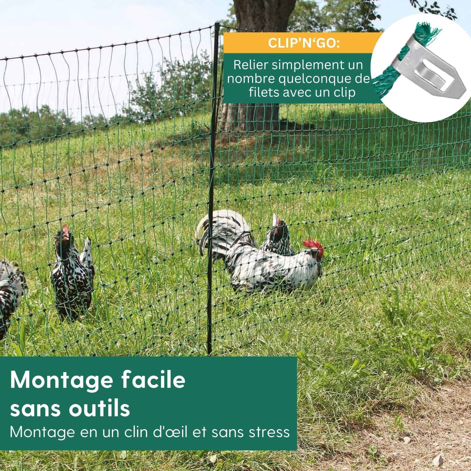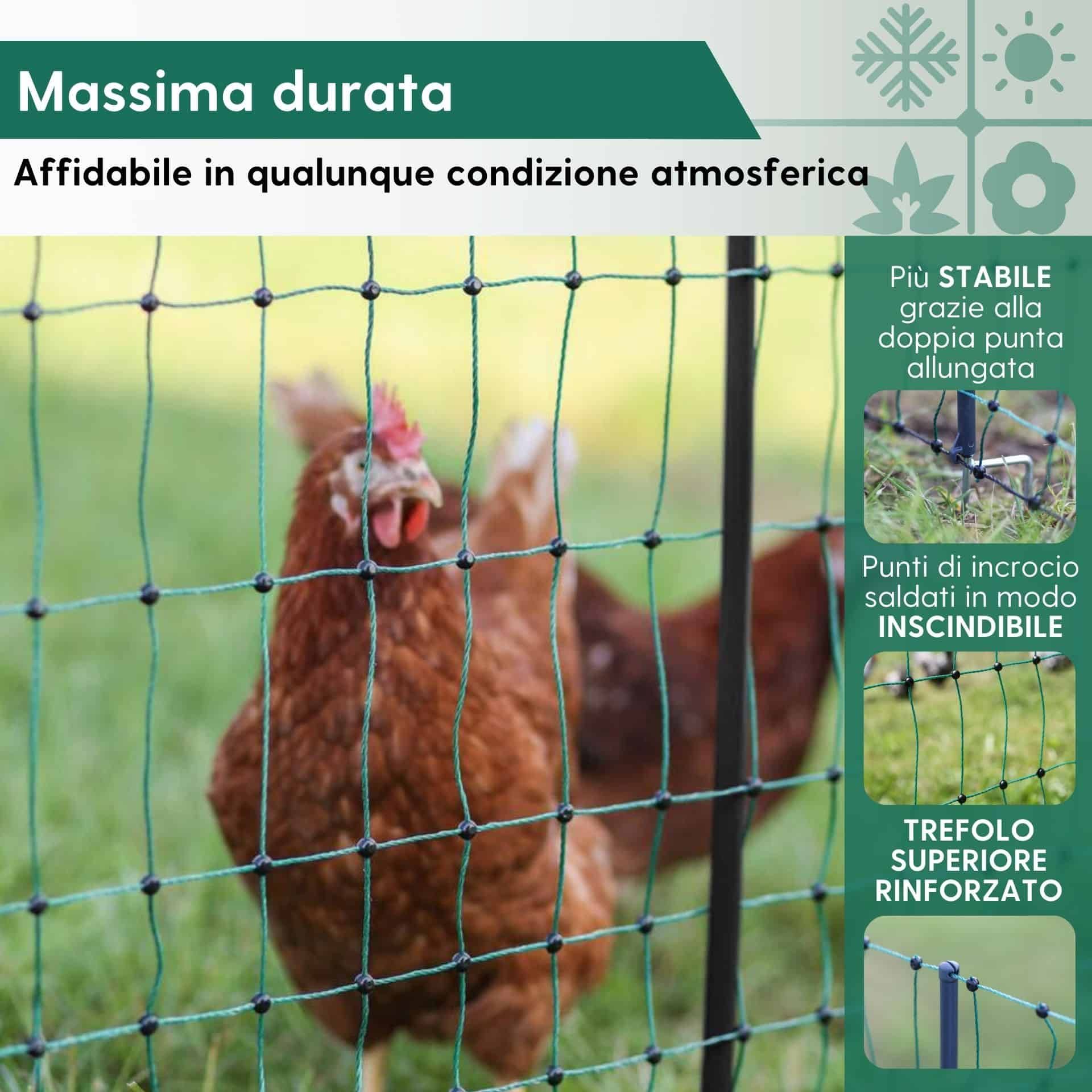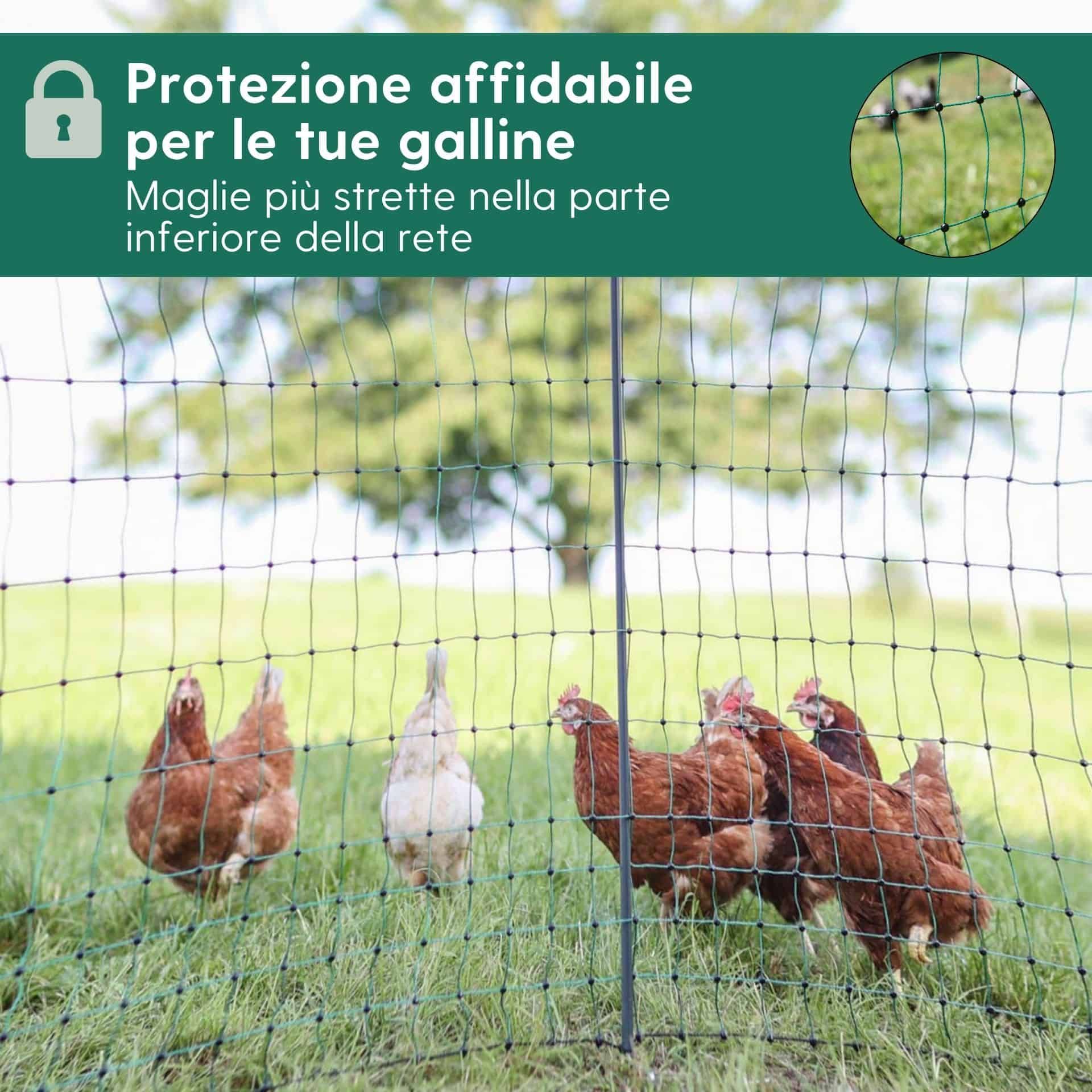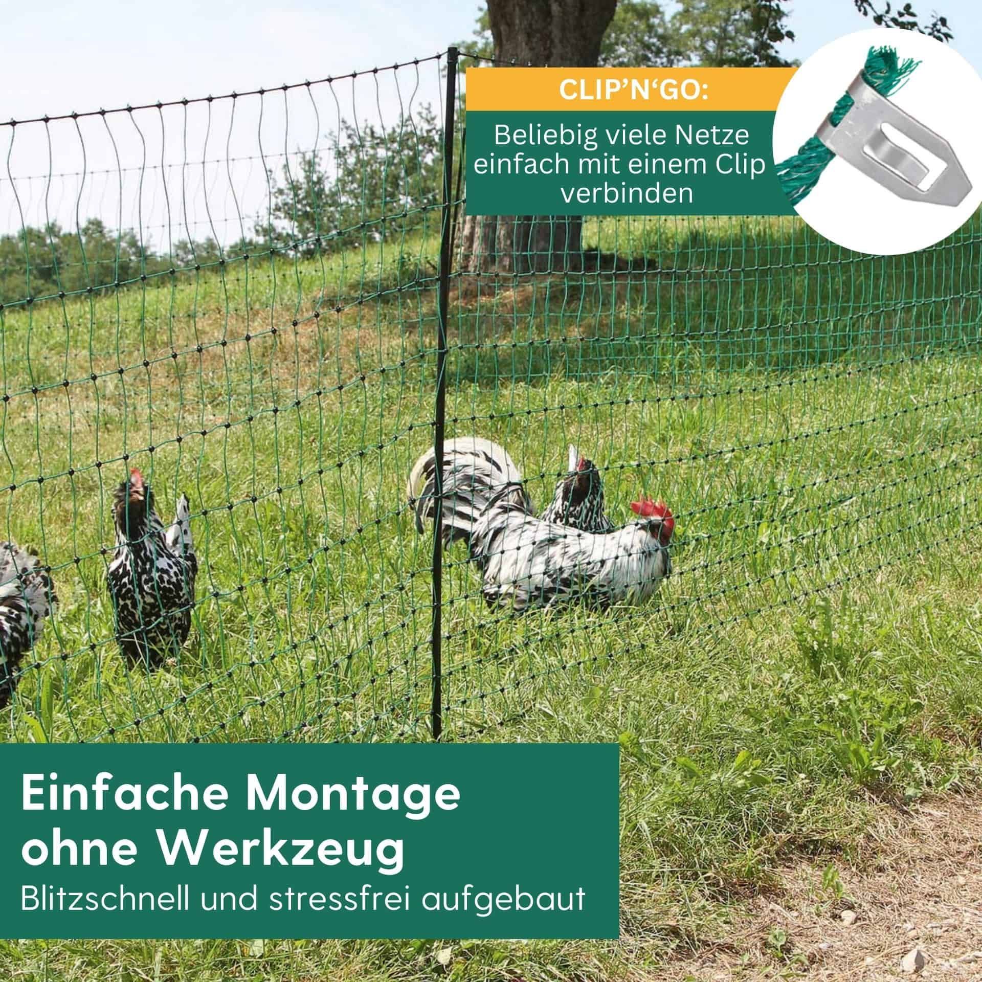 Plasa pentru păsări are ochiuri înguste în zona inferioară, ceea ce face ca plasa să fie deosebit de interesantă pentru pășunatul păsărilor de curte, cum ar fi puii, curcanii sau rațele. Dar și alte animale mai mici pot fi de asemenea îngrășate excelent cu gardul mobil, cum ar fi porcii, caprele, câinii sau ca plasă pentru oi. În plus față de ochiurile mai înguste, se previne căderea plasei cu ajutorul firului superior întărit. Stâlpii din plastic robust, cu vârfuri duble, asigură o bună rezistență a gardului pe soluri nisipoase sau pământoase. Proprietățile bune de pășunat sunt asigurate în plus de un sigiliu din plastic la fiecare punct de intersecție a ochiurilor de plasă, care este sudat în mod nedetașabil. Gardul este prevăzut cu un fir verde, ceea ce îl face să se integreze în mod deosebit de armonios în mediul înconjurător. Pentru o stabilitate suplimentară, vă recomandăm să plasați un stâlp de lemn în fiecare colț al plasei.