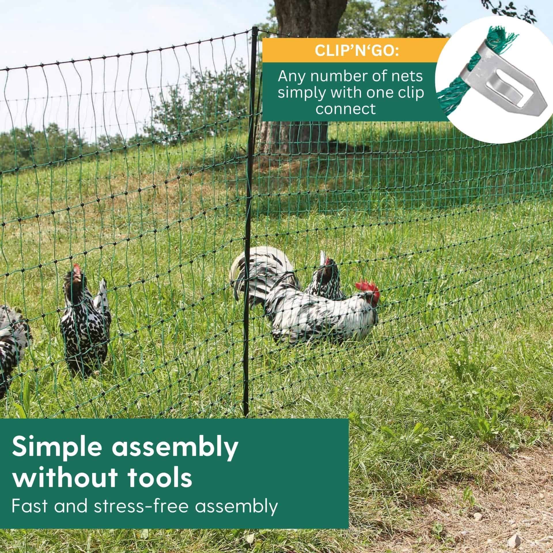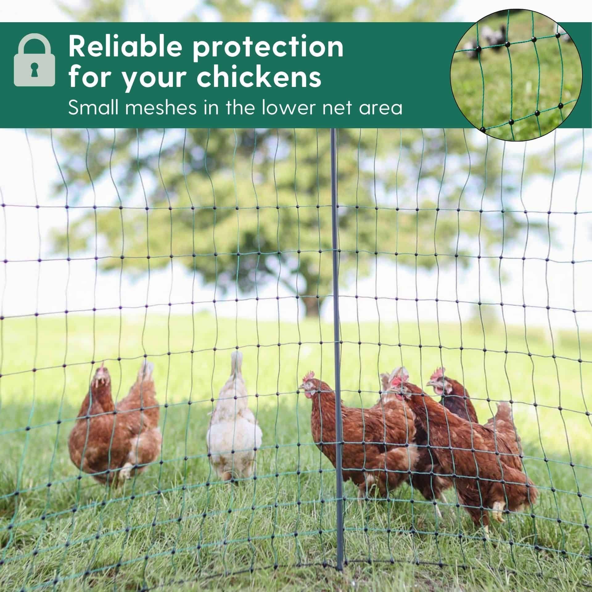 Configurați cu ușurință și rapid un spațiu sigur pentru găinile dvs. cu plasa noastră mobilă din salcie de top, cu un raport preț-performanță excelent. Plasa pentru păsări de curte are ochiuri înguste în zona inferioară, ceea ce face ca plasa să fie deosebit de interesantă pentru creșterea găinilor, curcanilor sau a rațelor, de exemplu. În plus față de ochiurile mai înguste, firul superior întărit împiedică plasa să se încovoaie. Plasa de răchită este ușor de montat, extins și demontat. Gardul pentru găini fără electricitate poate fi extins cu ușurință cu alte plase sau cu o poartă pentru plasele de gard pentru pășuni. Plasa de gard pentru pășunat poate fi montată și demontată în câteva secunde, ceea ce o face perfectă pentru perioadele scurte de pășunat. Poate fi rulată și depozitată cu ușurință pentru a economisi spațiu.