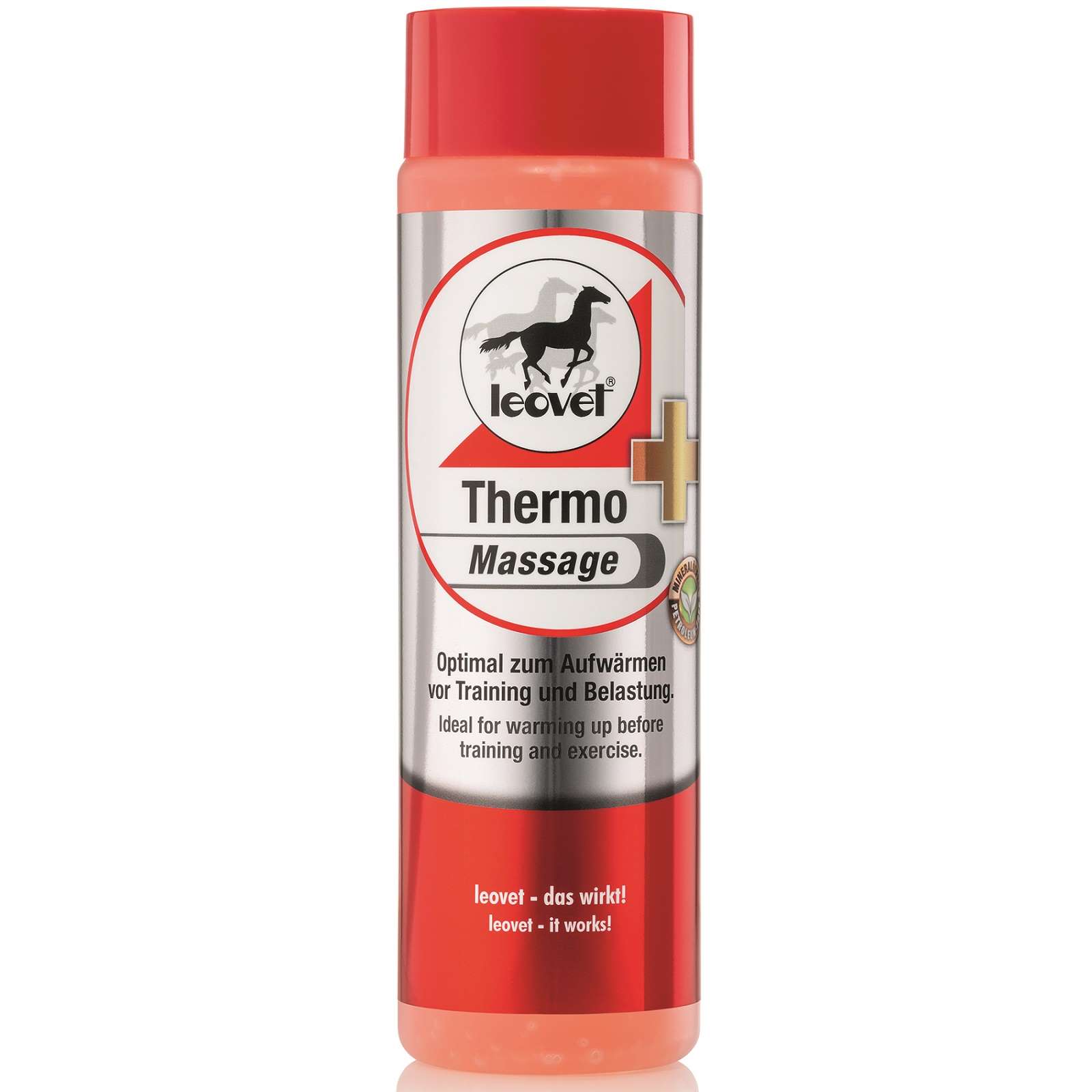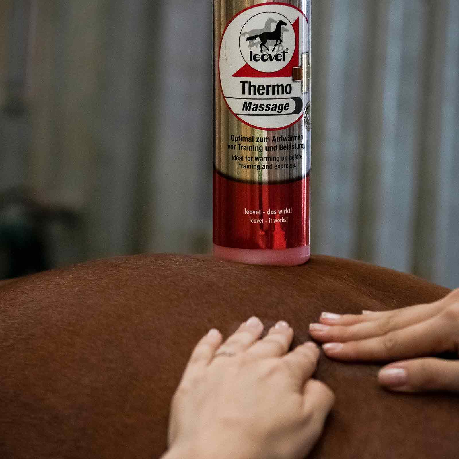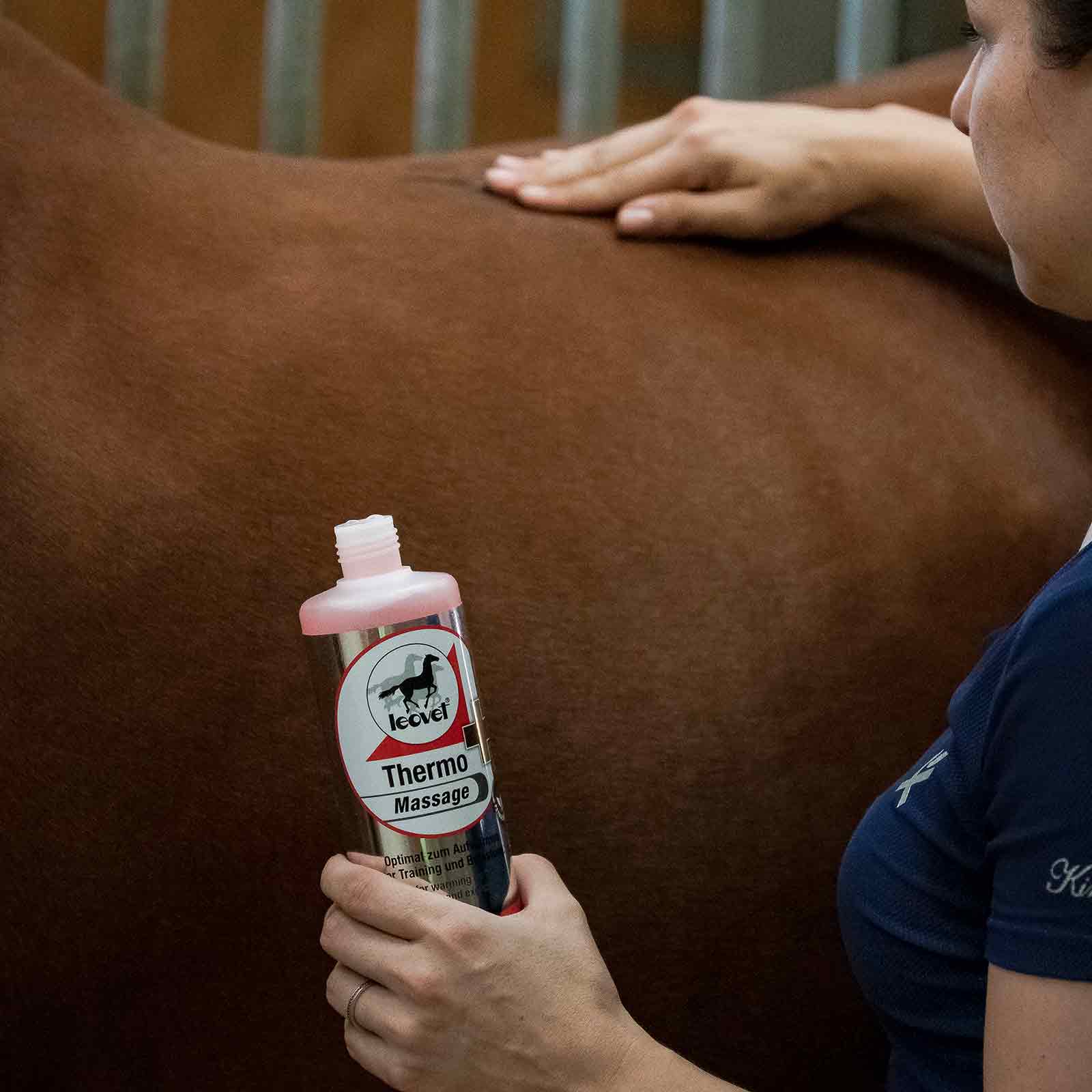 Gelul de termo-masaj Leovet se încălzește în mod specific fără un masaj îndelungat. Aceasta ameliorează tensiunea musculară și, prin urmare, este ideal pentru încălzirea înainte de antrenament și efort. Thermo Massage Gel este deosebit de plăcut pentru mușchii spatelui înainte de a pune șaua pe șa. Uleiul de bergamotă conținut din fructele de bergamotă ajută la slăbirea mușchilor. Gelul de masaj poate fi folosit și după antrenament pentru relaxare ulterioară. Datorită duratei scurte de acțiune, se evită supra stimularea pielii și a țesuturilor.