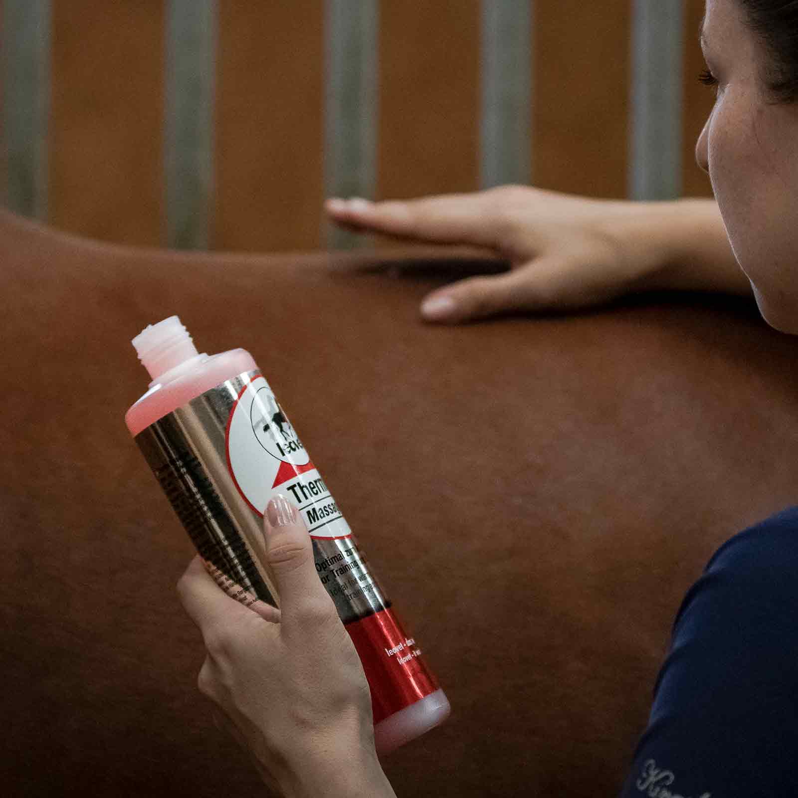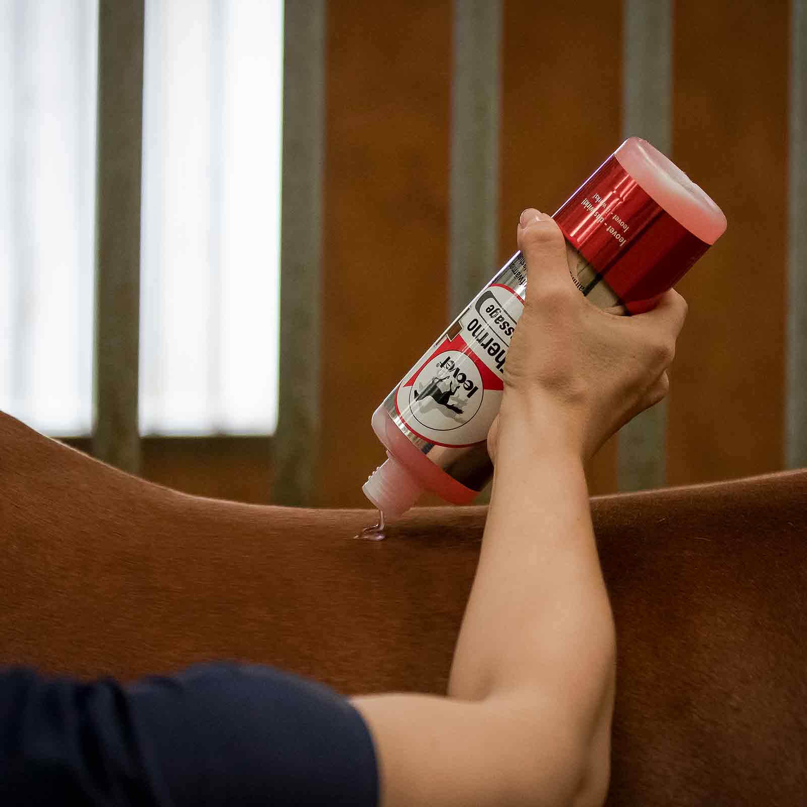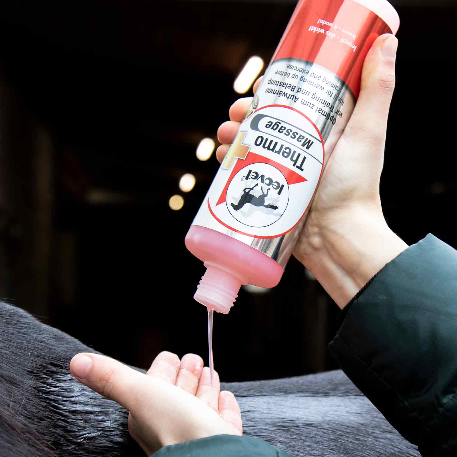 Gelul de termo-masaj Leovet se încălzește în mod specific fără un masaj îndelungat. Aceasta ameliorează tensiunea musculară și, prin urmare, este ideal pentru încălzirea înainte de antrenament și efort. Thermo Massage Gel este deosebit de plăcut pentru mușchii spatelui înainte de a pune șaua pe șa. Uleiul de bergamotă conținut din fructele de bergamotă ajută la slăbirea mușchilor. Gelul de masaj poate fi folosit și după antrenament pentru relaxare ulterioară. Datorită duratei scurte de acțiune, se evită supra stimularea pielii și a țesuturilor.