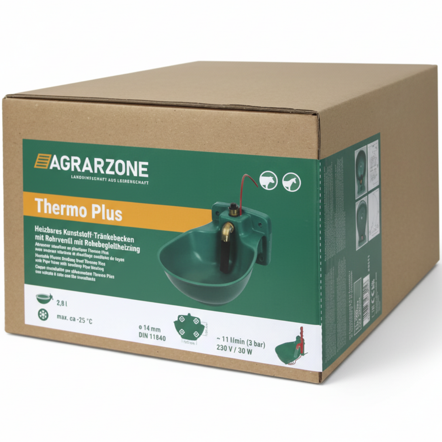 Adăpător încălzit pentru vite și cai, fabricat din plastic de înaltă calitate, este rezistent la îngheț până la aproximativ -25 °C. Adăpătorul are un cablu de încălzire integrat și ușor de înlocuit și un cablu de încălzire suplimentar pentru o țeavă de aproximativ 2 metri lungime. Termostatul extern de protecție împotriva înghețului, de asemenea integrat, pornește cablul de încălzire la +3 °C și îl oprește din nou la aproximativ +13 °C. Capacul de pe partea inferioară a adăpătorului și construcția închisă din zona de intrare a supapei au un efect izolator și împiedică scurgerea căldurii degajate de cablul de încălzire.
