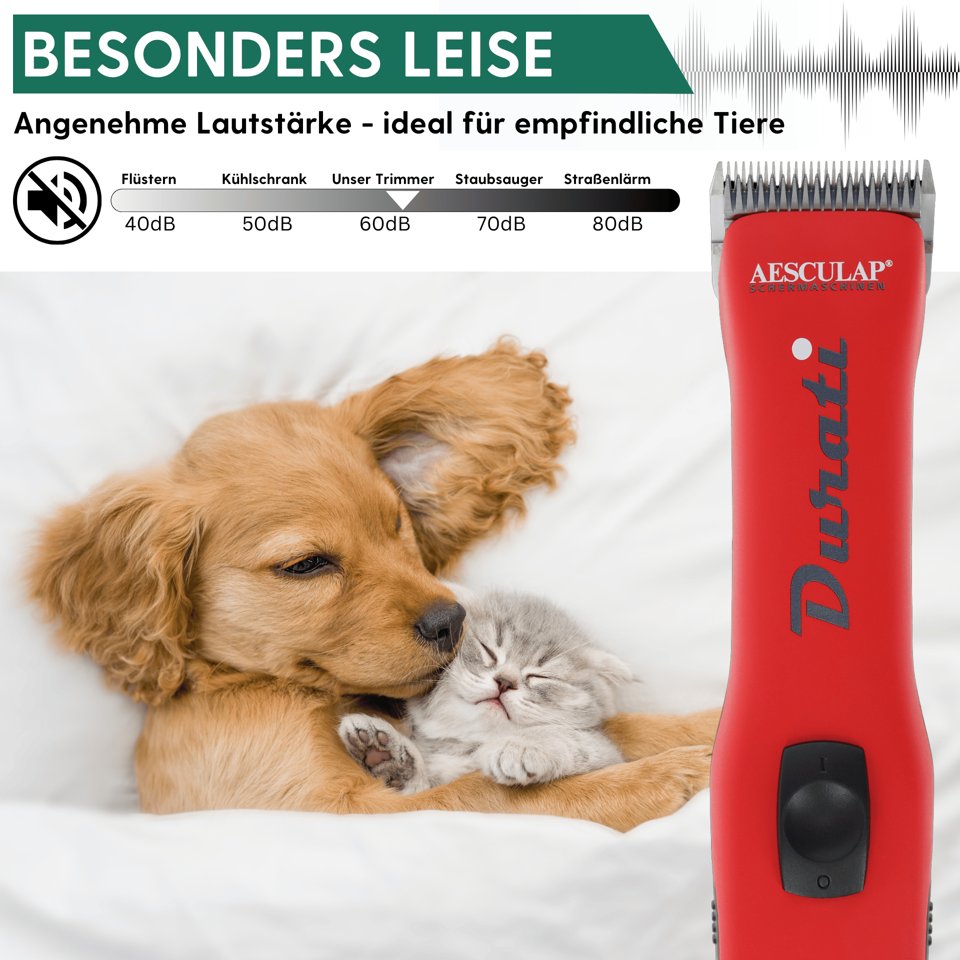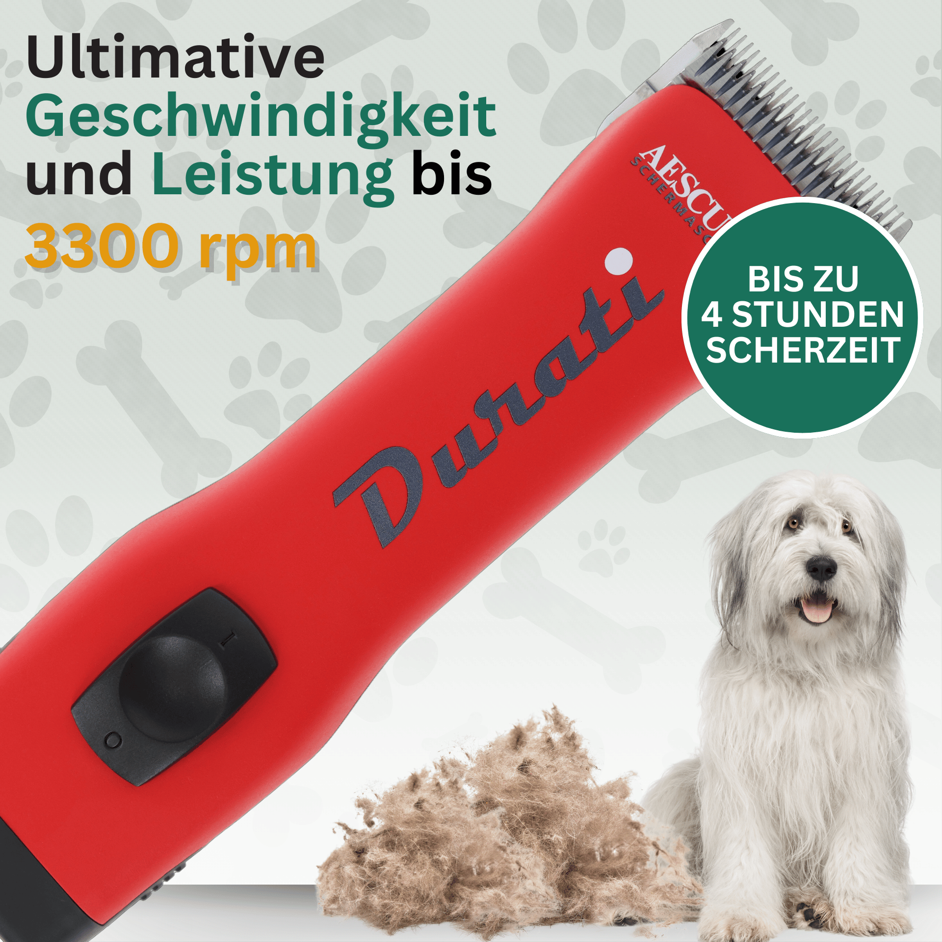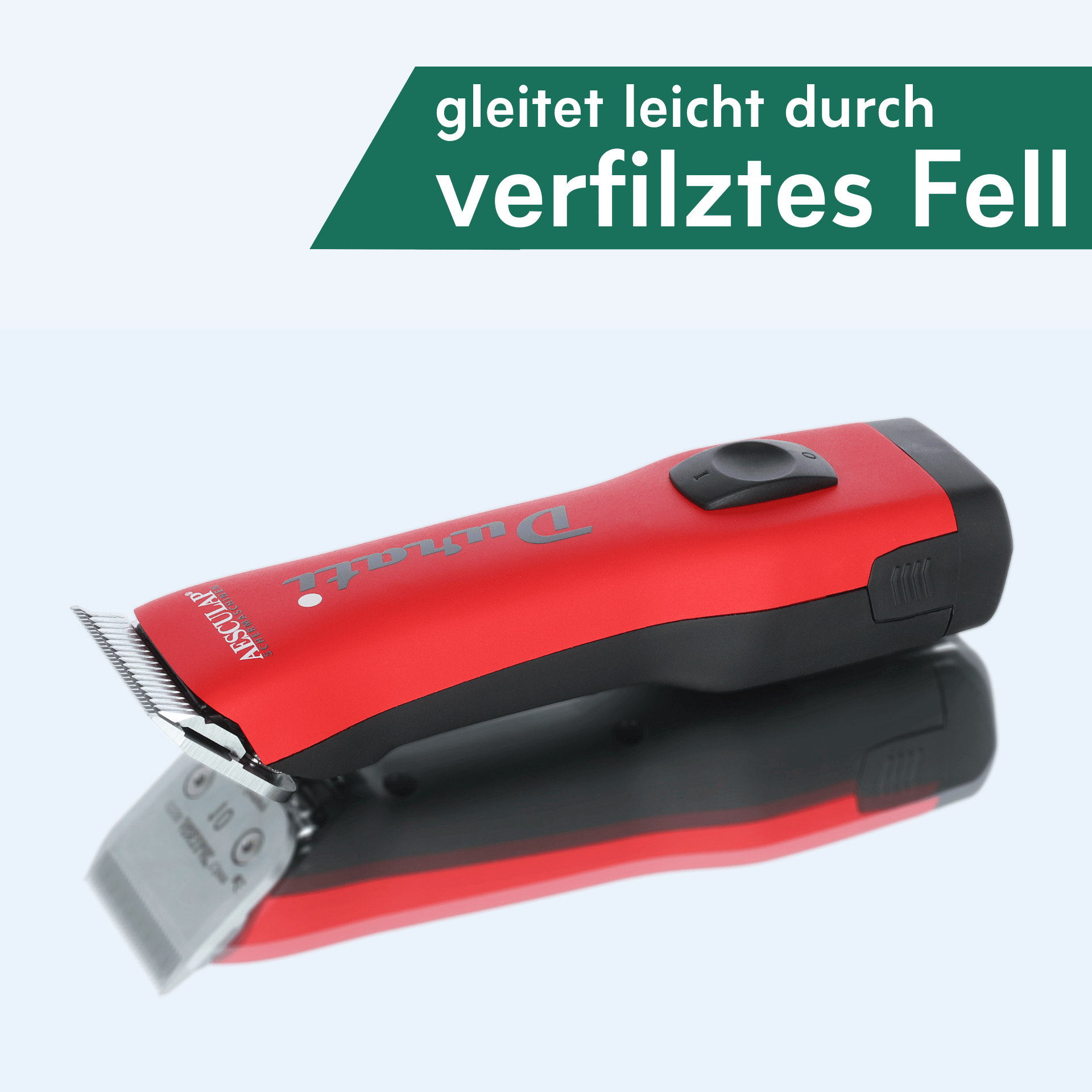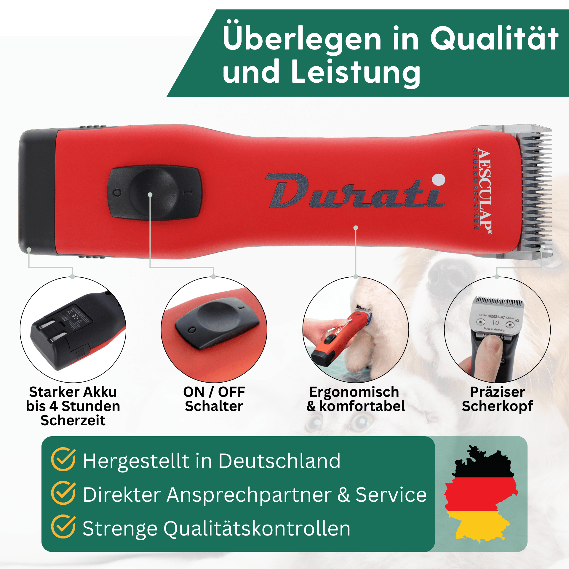 Mașina de tuns Durati este potrivită atât pentru profesioniști, cum ar fi îngrijitorii sau veterinarii, cât și pentru proprietarii de câini pretențioși. Greutatea ușoară și echilibrată, combinată cu performanțele sofisticate obișnuite ale Aesculap și, în același timp, cu cea mai lungă durată de viață a bateriei, au ca rezultat un produs de clasă superioară în segmentul SnapOn. Mașina de tuns animale este produsă în Germania și promite funcționalitate și fiabilitate.