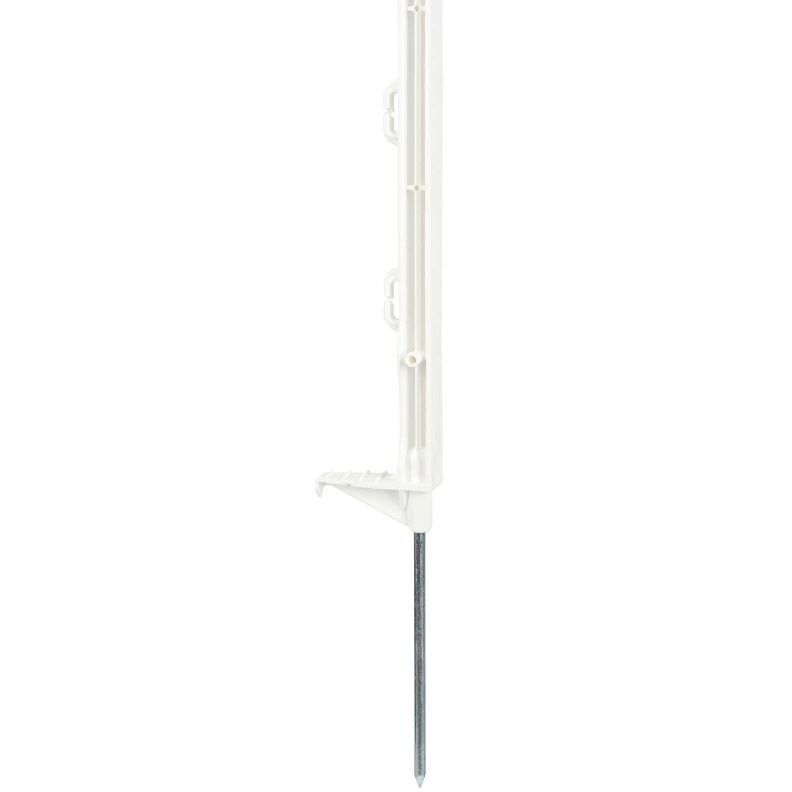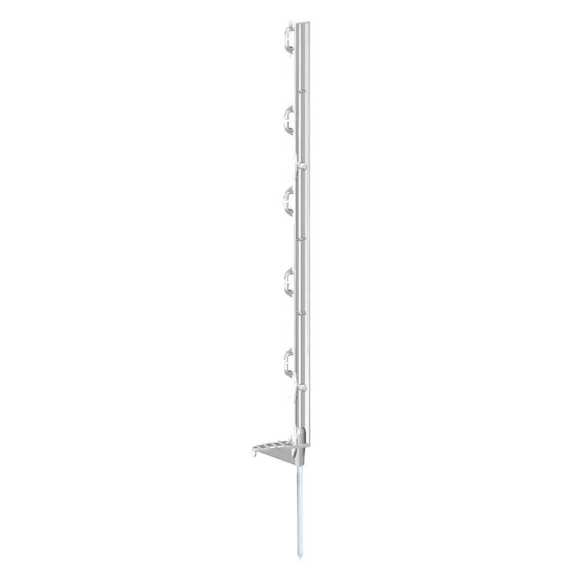 Stâlpul din plastic cu o singură treaptă și protecție împotriva răsucirii este, de asemenea, echipat cu un cui de sol galvanizat de 18 cm, ceea ce îi conferă o stabilitate ridicată. Cele 5 ochiuri de pe stâlpul de gard fac posibilă atașarea de panglici (până la 2 cm) sau frânghii pentru a asigura o împrejmuire fiabilă.