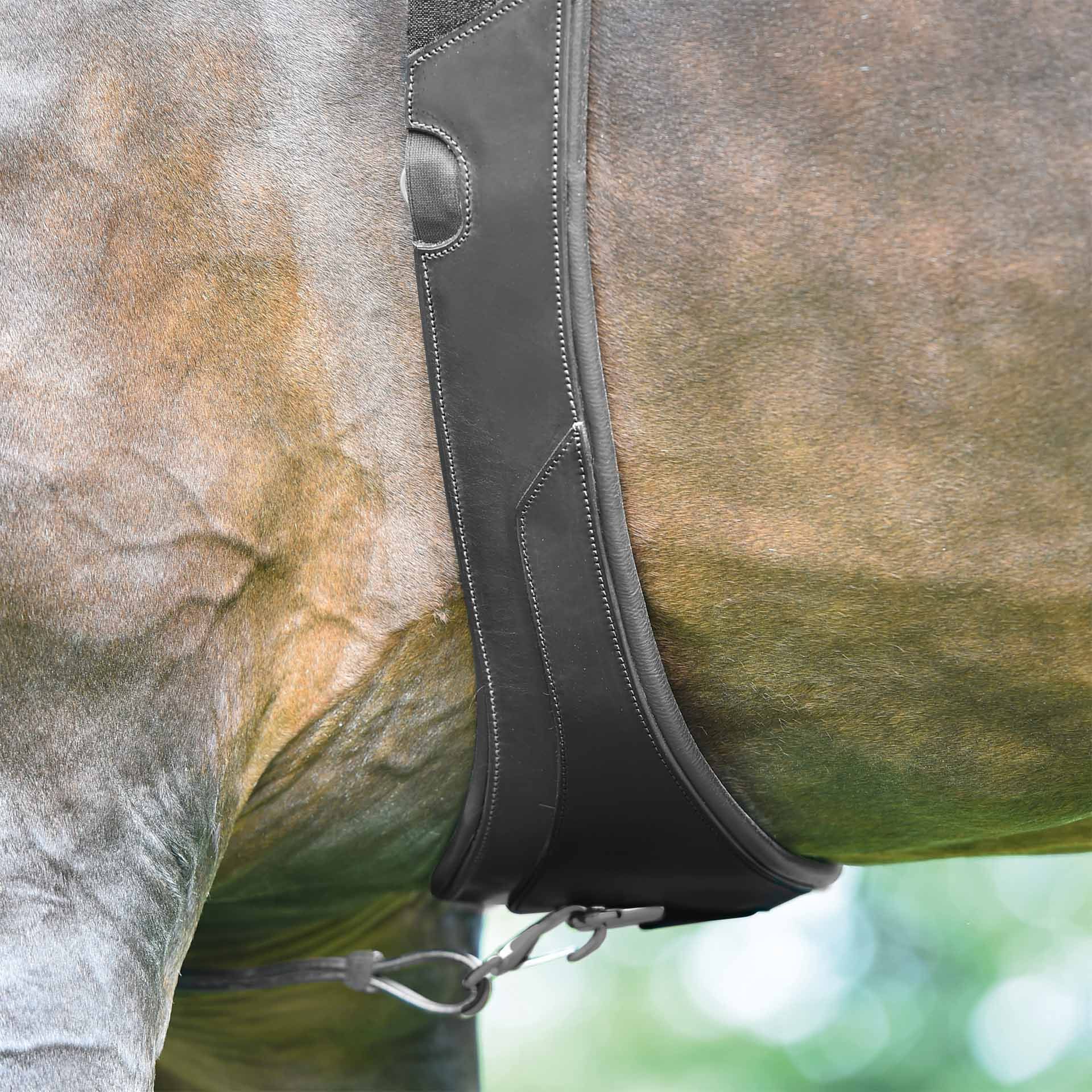 When strapping and re-strapping, make sure that the strap is as loose as possible and only tightened as much as necessary. The correct position of the belt must always be ensured. A flat hand should fit easily between the horse's body and the girth at about elbow height. In addition, the straps of the saddle should ideally be guided vertically downwards from the saddle girth, without pulling forward or backward, and the girth should rest evenly on the breastbone. Check the horse regularly for pressure and rubbing areas.