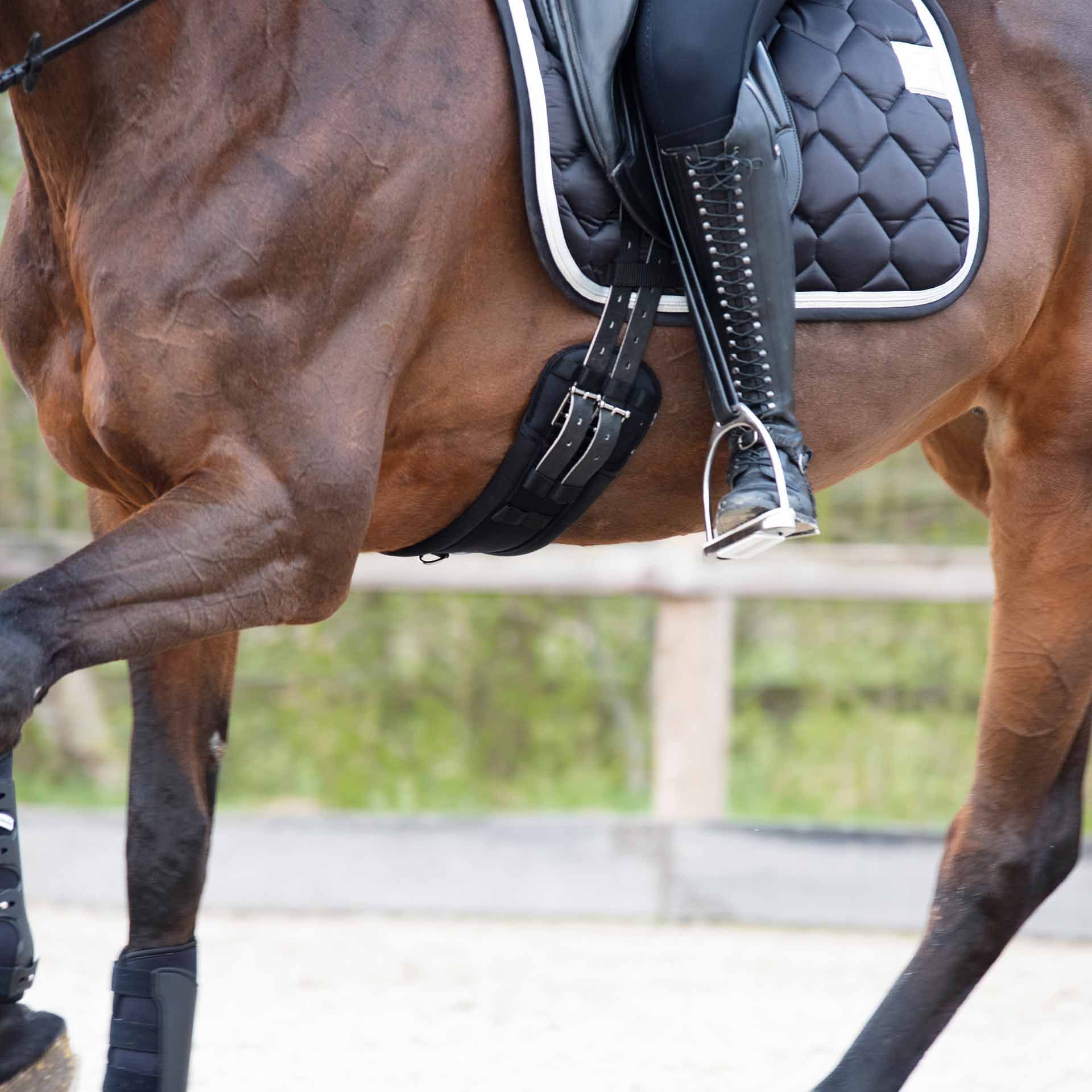 When strapping and re-strapping, make sure that the strap is as loose as possible and only tightened as much as necessary. The correct position of the belt must always be ensured. A flat hand should fit easily between the horse's body and the girth at about elbow height. In addition, the straps of the saddle should ideally be guided vertically downwards from the saddle girth, without pulling forward or backward, and the girth should rest evenly on the breastbone. Check the horse regularly for pressure and rubbing areas.