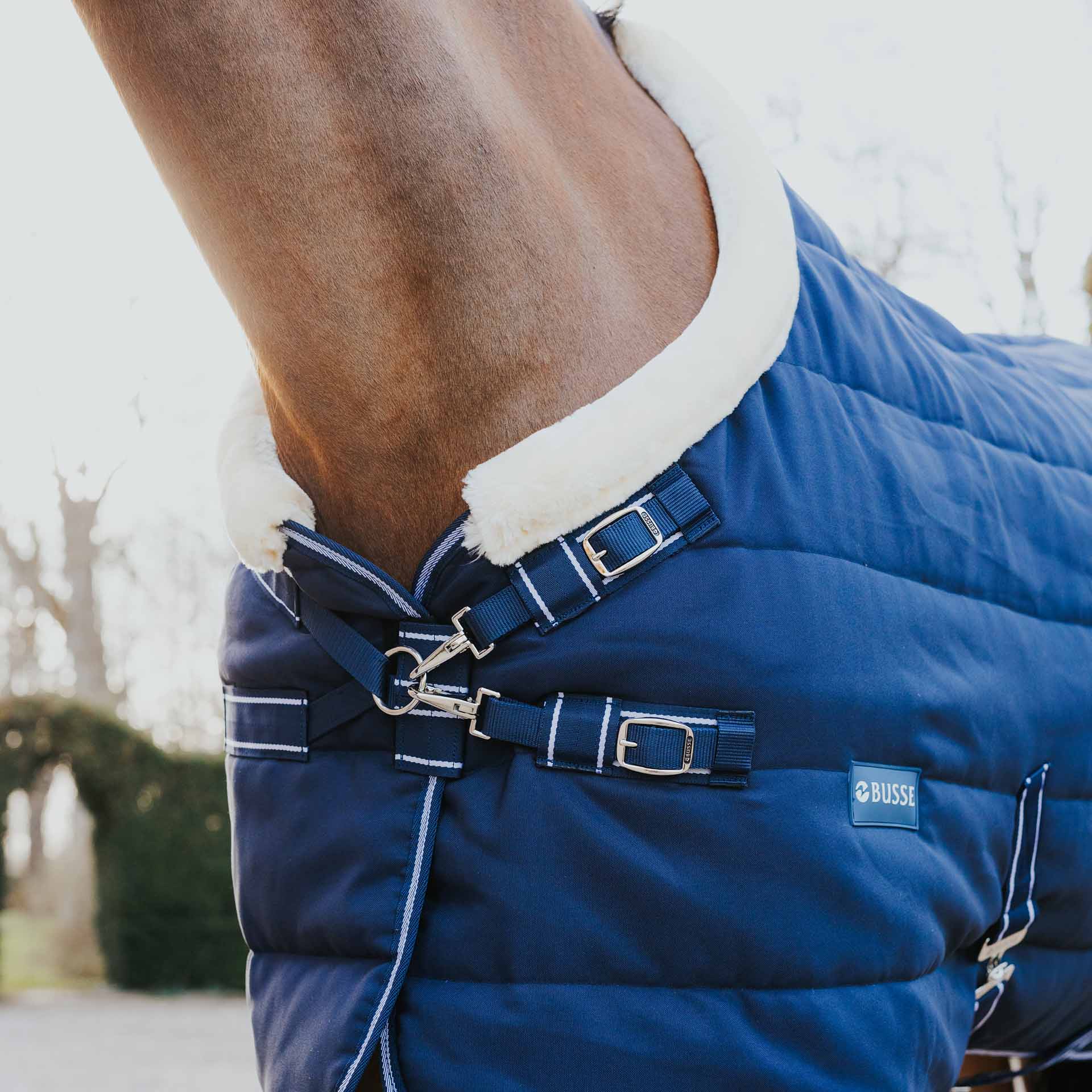 For the final adjustment of a horse blanket, the adjustment options on the product should be used, as incorrect application can lead to damage. Even with optimal adjustment, regular checks of the fit are essential. Check that the blanket fits correctly, the Velcro fasteners are clean (to avoid chafing) and the blanket is intact.