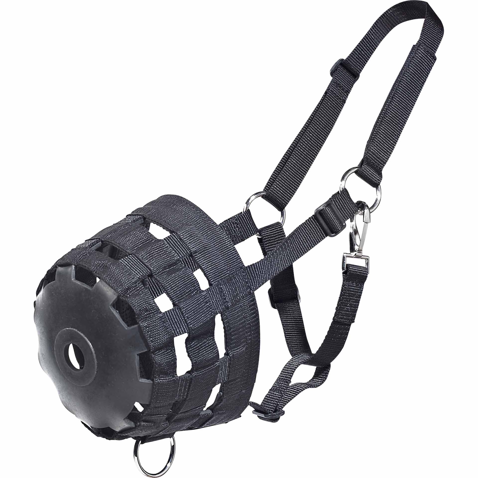 Muzzleul are un fund de cauciuc cu o dietă pentru hrănire (Ø 2,5 cm), ceea ce permite calului tău să mănânce fără a -i permite să intre în cantități mari de alimente. Fabricat dintr -o bandă robustă de pânză, asigură ventilația mare și o durată extinsă. De asemenea, include o șină reglabilă în cinci poziții, asigurându -vă că mușchiul este perfect potrivit pentru calul dvs.
