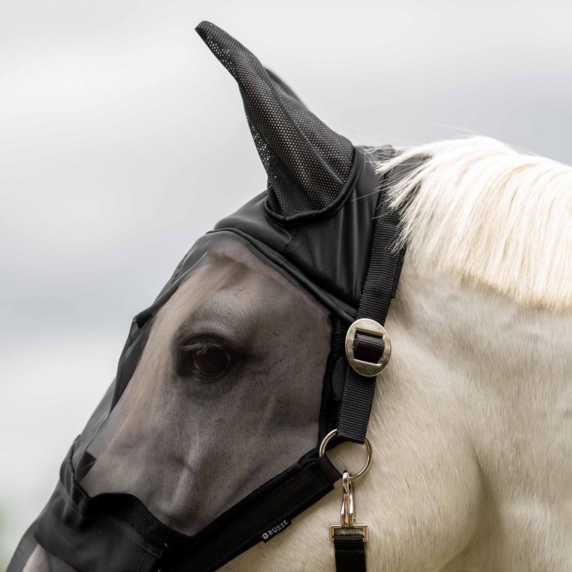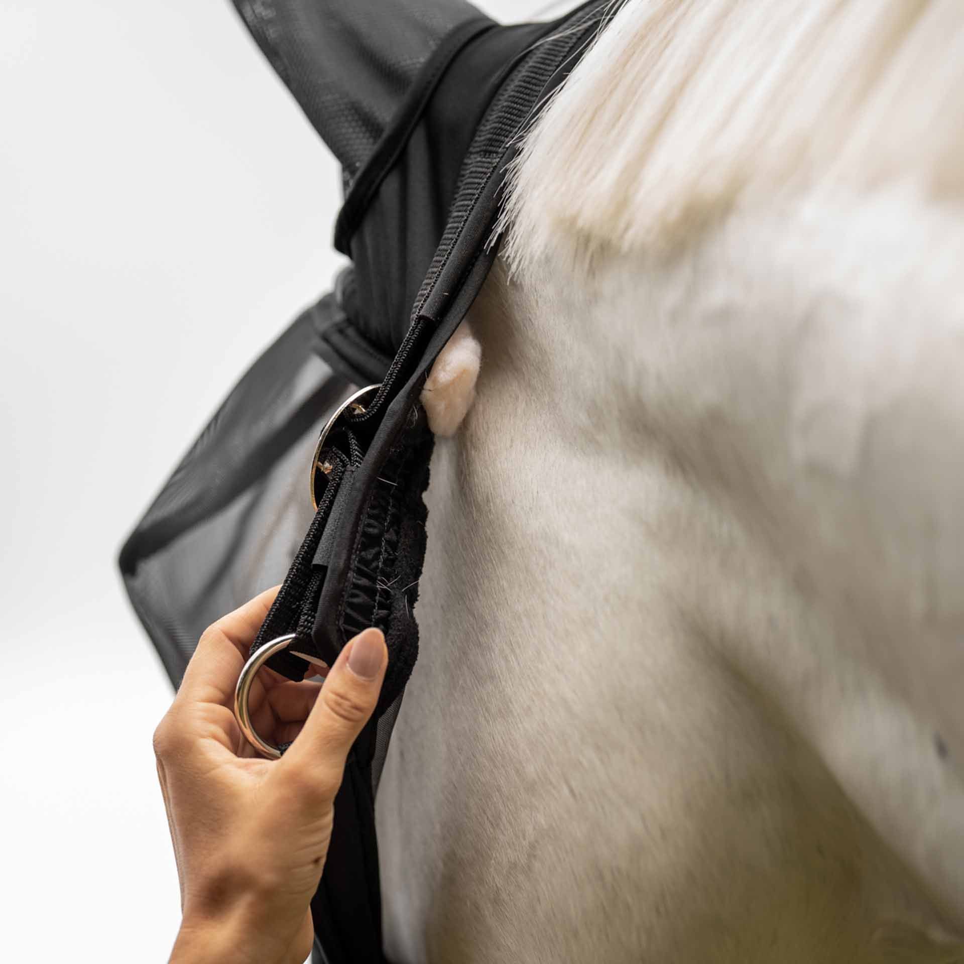 A fly mask has to fit well to be able to help. Otherwise damage may occur. The fit must fit the horse/pony's head. You can make a final adjustment using any setting options on the product. Even with an optimally fitted fly mask, the fit must be checked regularly, conscientiously and professionally and corrected if necessary. If the fly mask slips, vision can be limited or lost. For the horse, a flight animal, this can lead to panic and cause accidents. The ideal seat can be jeopardized by, for example, rubbing in the head area or conspecifics kept in groups. The use of fly masks is not recommended in such individual cases. Check the fur and skin regularly for chafing. Even with optimally fitting fly masks, these can be caused by foreign substances (e.g. stones, insects) between the mask and the horse. The risk of skin irritation increases due to sweat. Clean the mask regularly.