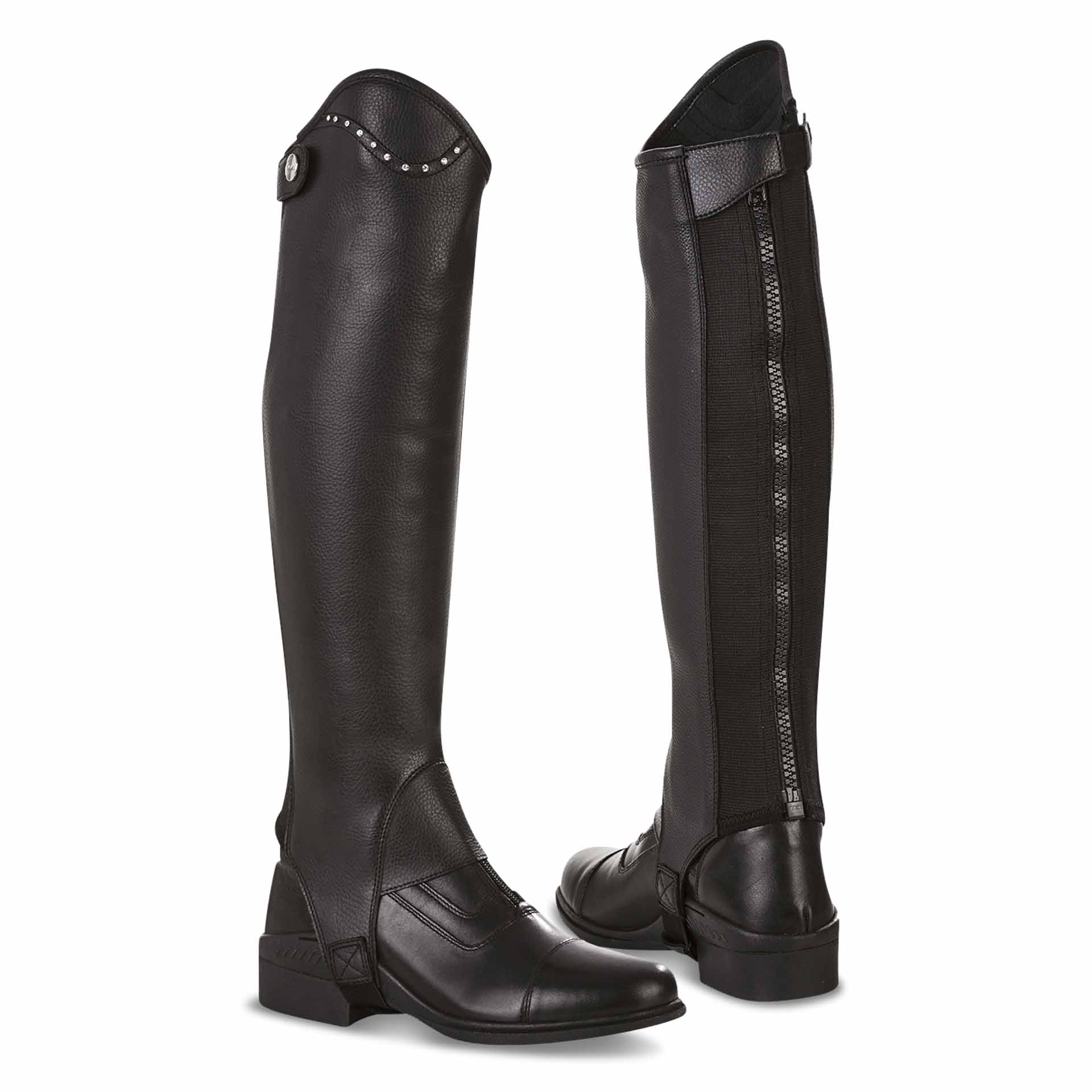 Ghetele moi de cristal-jr de busse sunt echipate cu o balamală YKK® Vislon rezistentă, care se extinde de jos în sus, cu elasticitate încorporată pe ambele părți. O fâșie de piele cu buton elastic și de presiune asigură o stabilitate optimă cu fermoar. Ghetul are un arc lateral decorat cu cristale care dau un efect vizual mai lung și o inserție față care acoperă jodhpurs -urile dvs. și oferă un rulment pentru curelele de pinten.