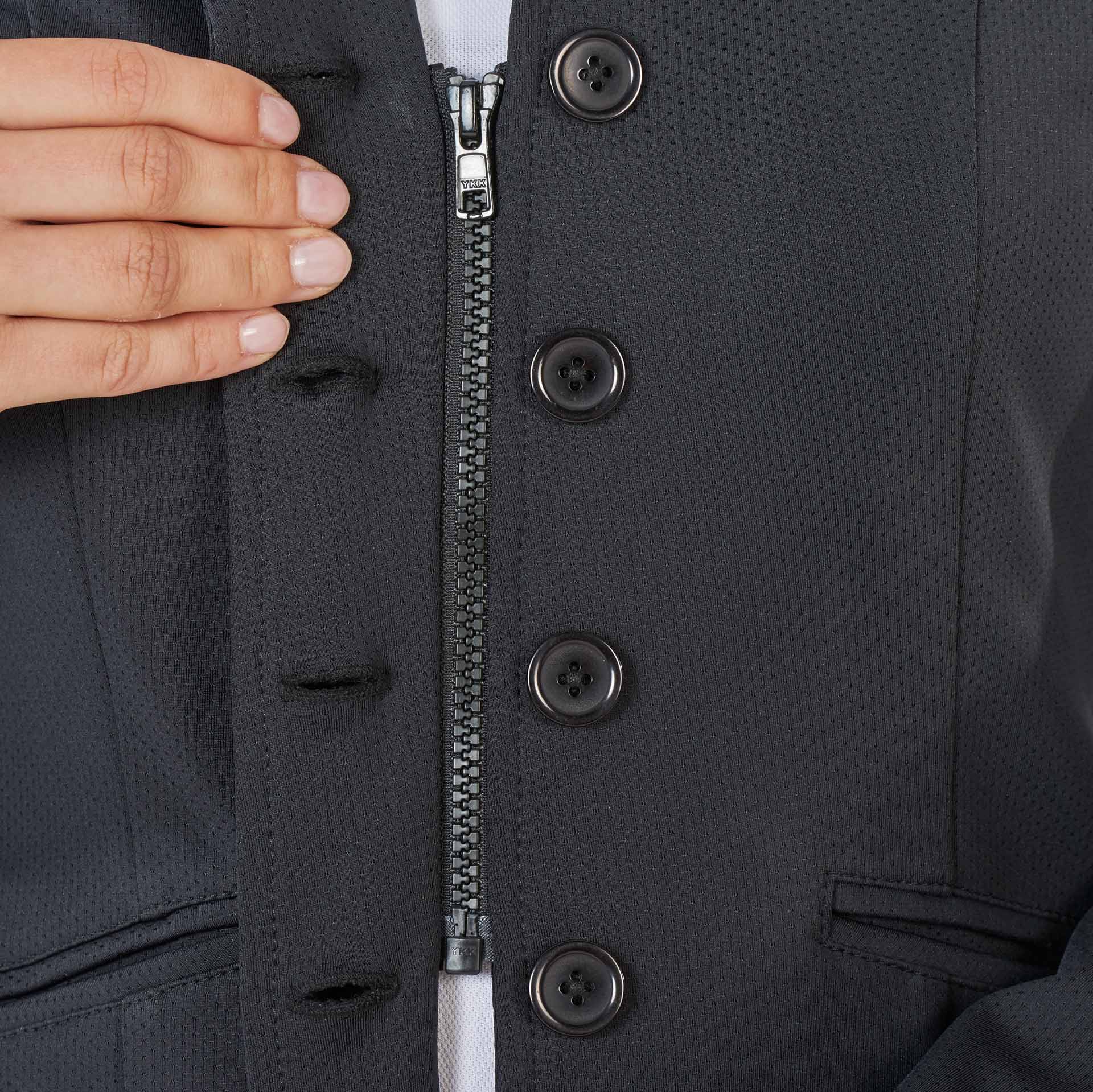 Designul jachetei este caracterizat prin butoane simple și două buzunare aplicate pe față. Are o tăietură clasică și personalizată, care oferă o linie elegantă și rafinată. Un detaliu important este fermoarul YKK® practic sub rândul de butoane, care asigură o prindere perfectă chiar și în șa.