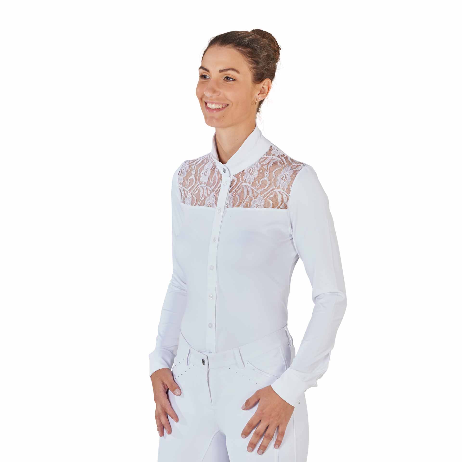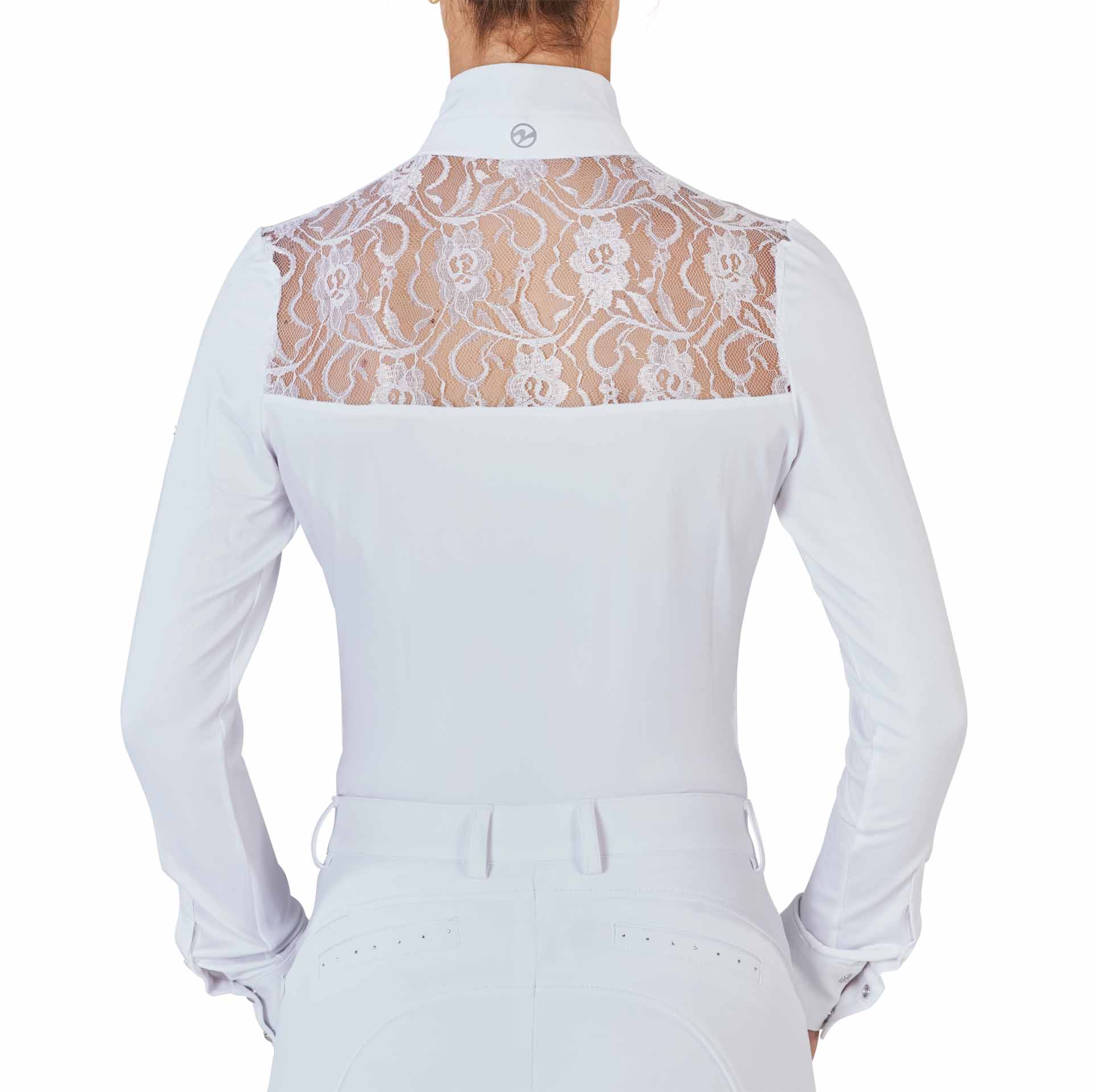 butonul clasic cu butoane de ton -on -ton și insertul de dantelă din partea superioară a pieptului și a umerilor fac ca această cămașă să fie unică în acest fel. Mânecile sunt îmbogățite cu două butoane cu strasuri pe manșetă, care adaugă o notă de strălucire ținutei tale de călărie.