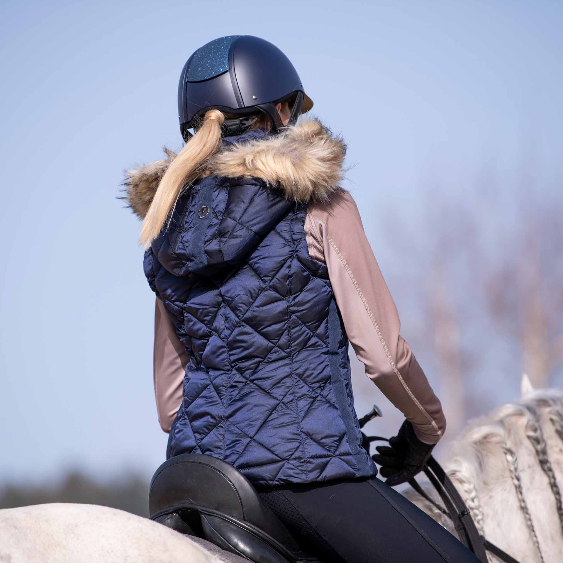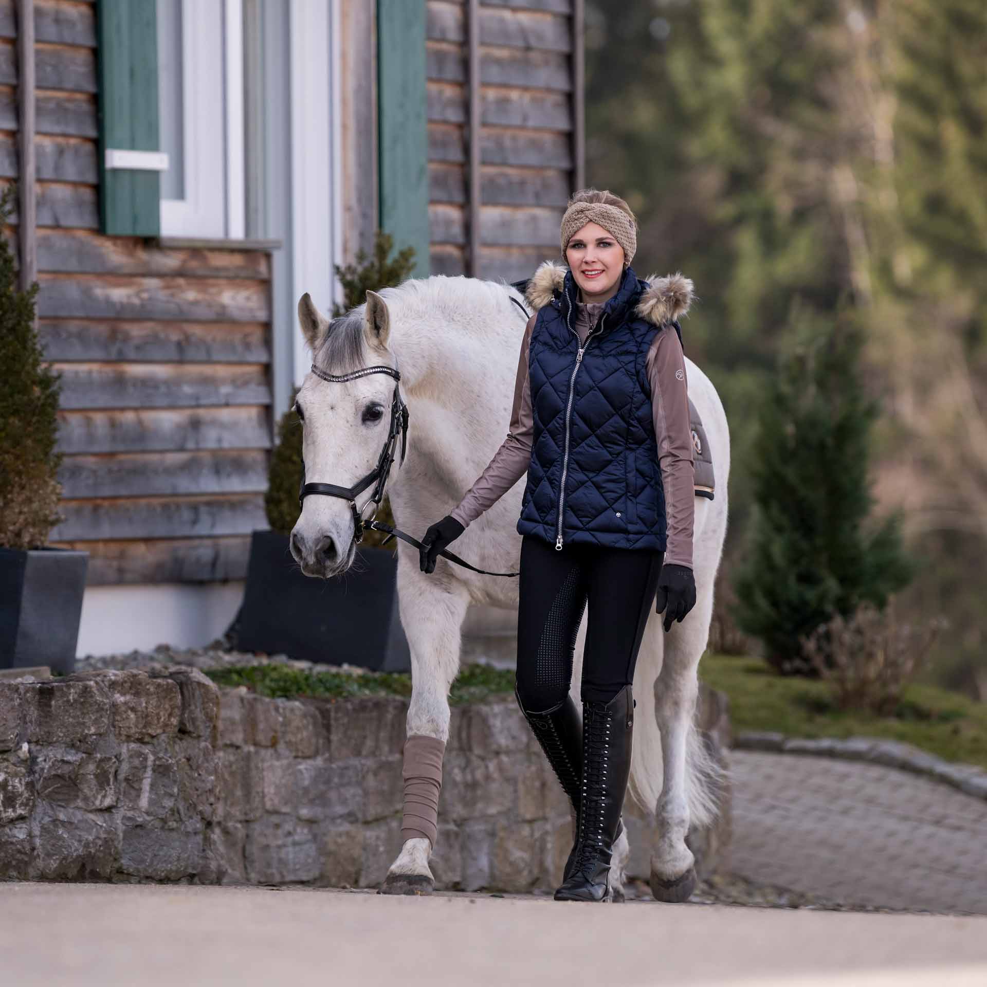 Briana Jet of Busse este o îmbrăcăminte de modă în formă rafinată pentru grajdul, orașul și utilizarea de zi cu zi. O vestă respirabilă cu o căptușeală ușoară care oferă căldură primitoare, fără a sacrifica stilul. Matlasarea elegantă și panglica decorativă de pe umeri, părțile laterale și capota fac din această vestă o tendință.