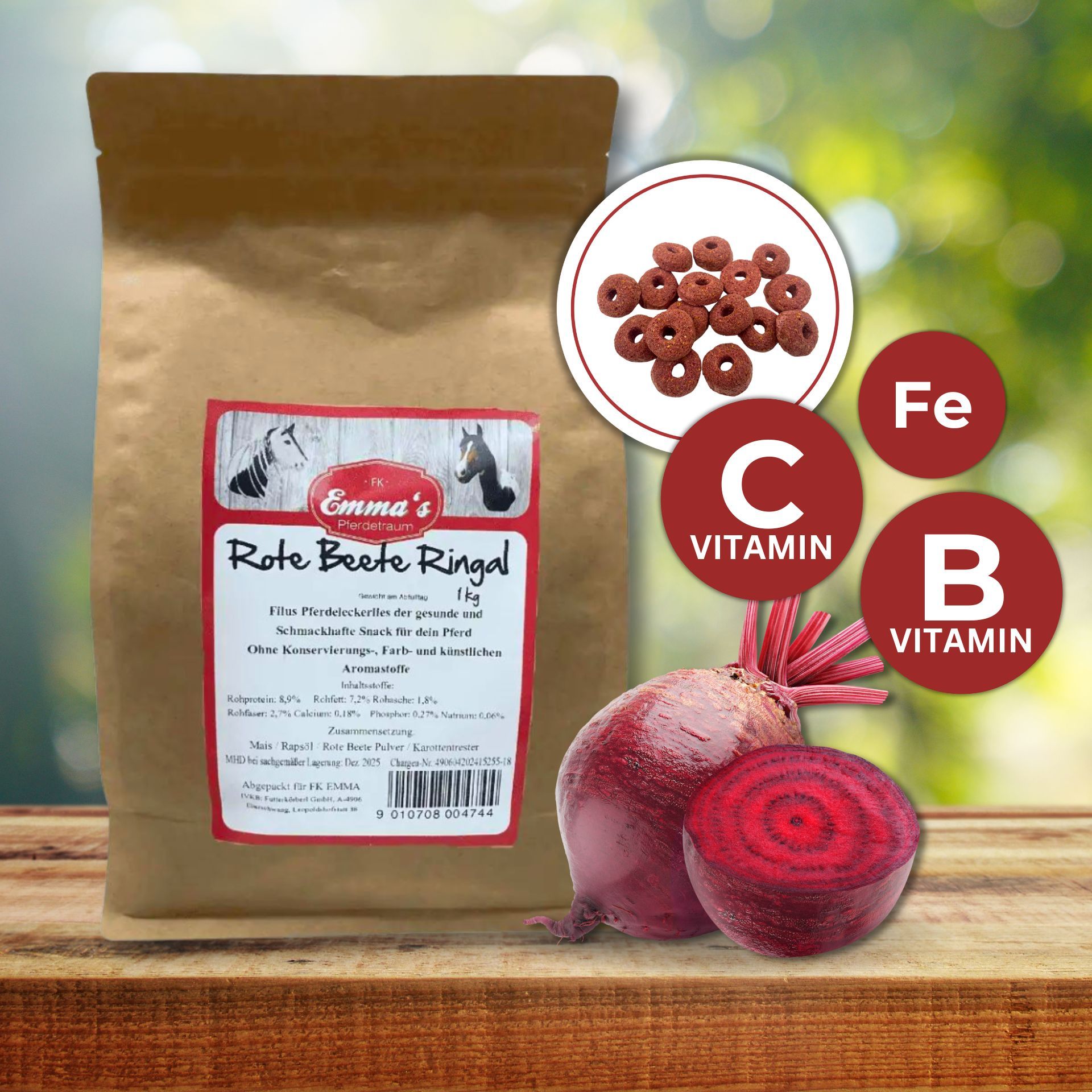 Emma's Horse Treats Red Beet Ringal is a high-quality, natural snack for your horse. These treats are 100% natural and come without artificial colors and preservatives – meaning they are completely free of chemicals. Thanks to the particularly intense flavor, the treats have an extremely high acceptance among horses. Produced in a small mill in Germany, they offer trustworthy quality you can rely on.