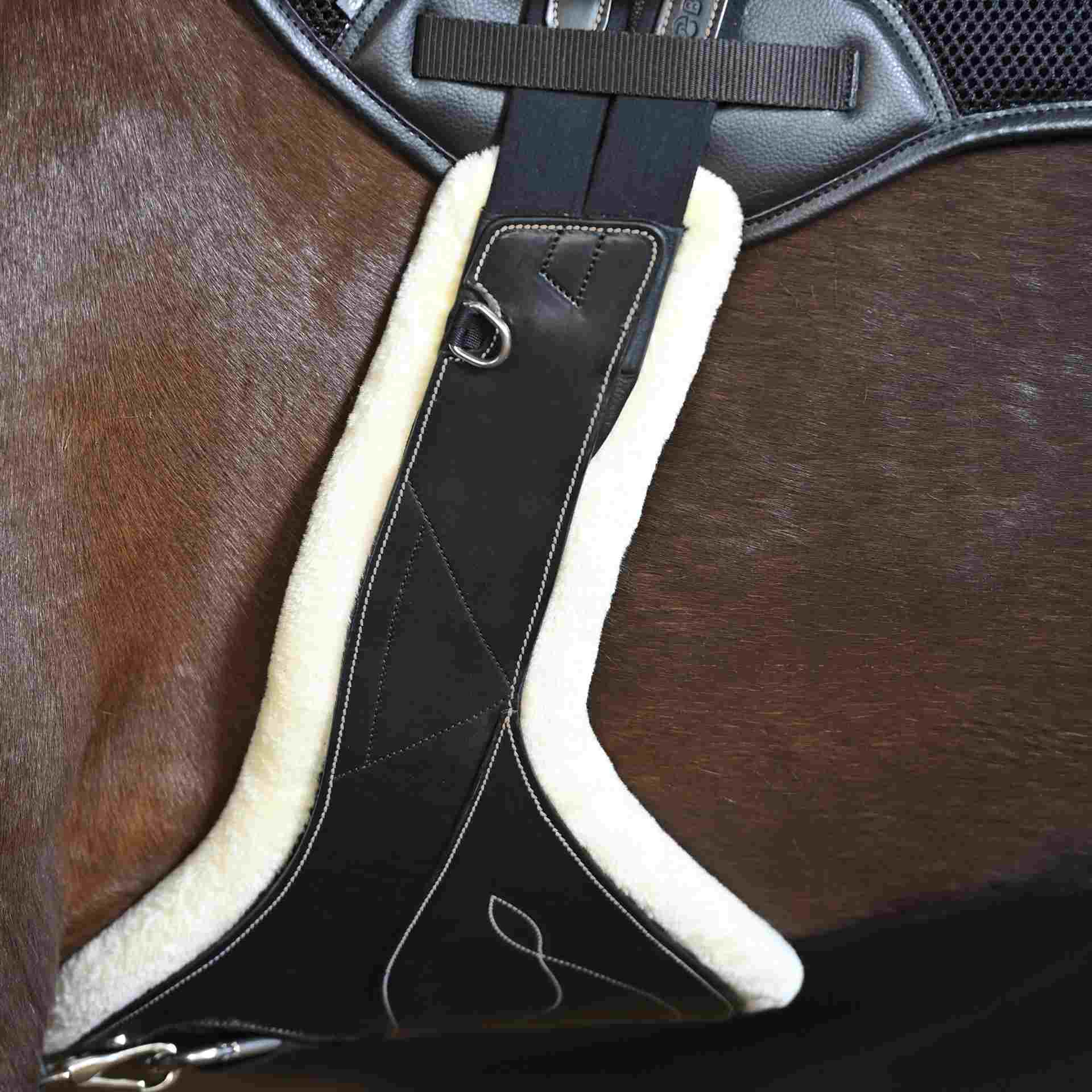When strapping and re-strapping, make sure that the strap is as loose as possible and only tightened as much as necessary. The correct position of the belt must always be ensured. A flat hand should fit easily between the horse's body and the girth at about elbow height. In addition, the straps of the saddle should ideally be guided vertically downwards from the saddle girth, without pulling forward or backward, and the girth should rest evenly on the breastbone. Check the horse regularly for pressure and rubbing areas.