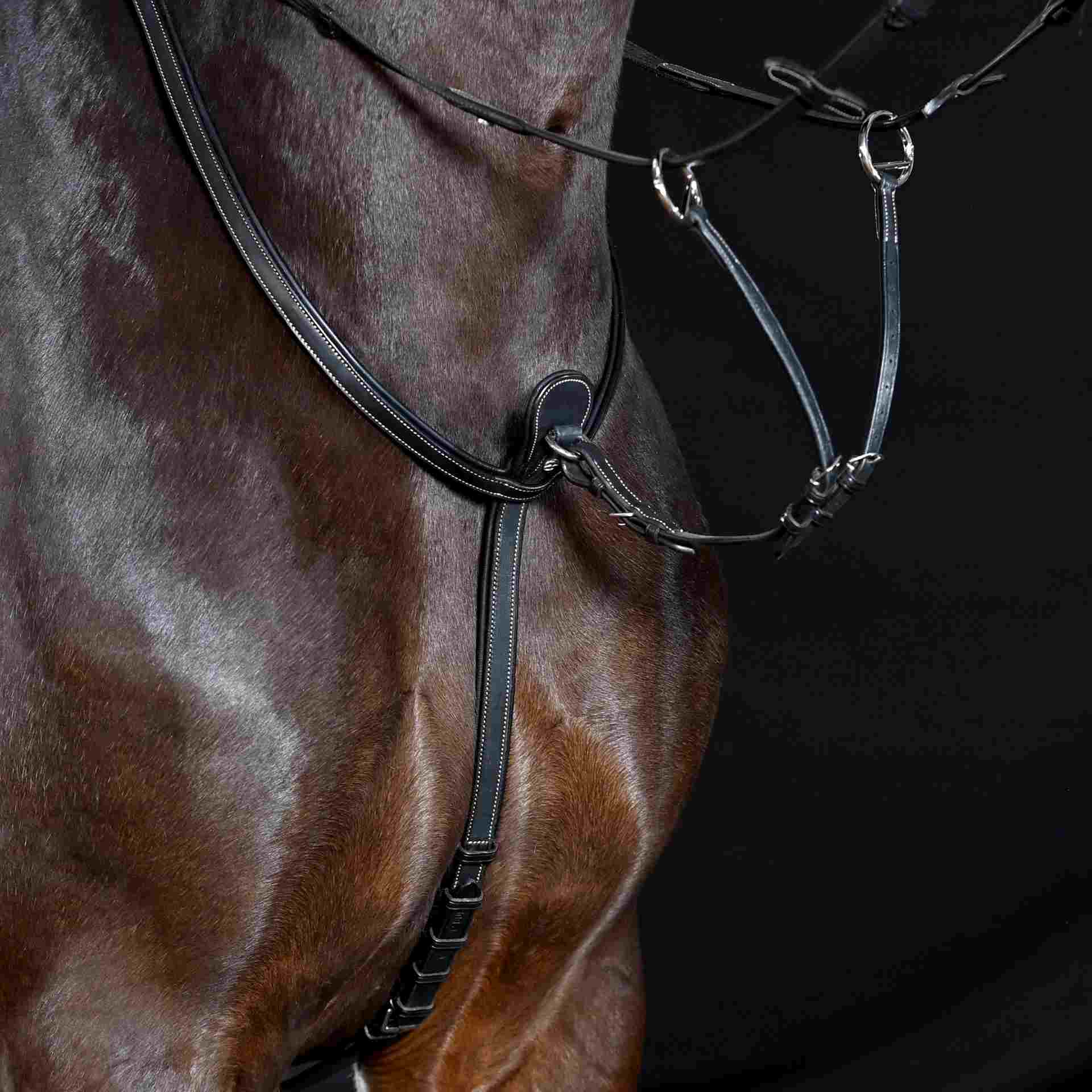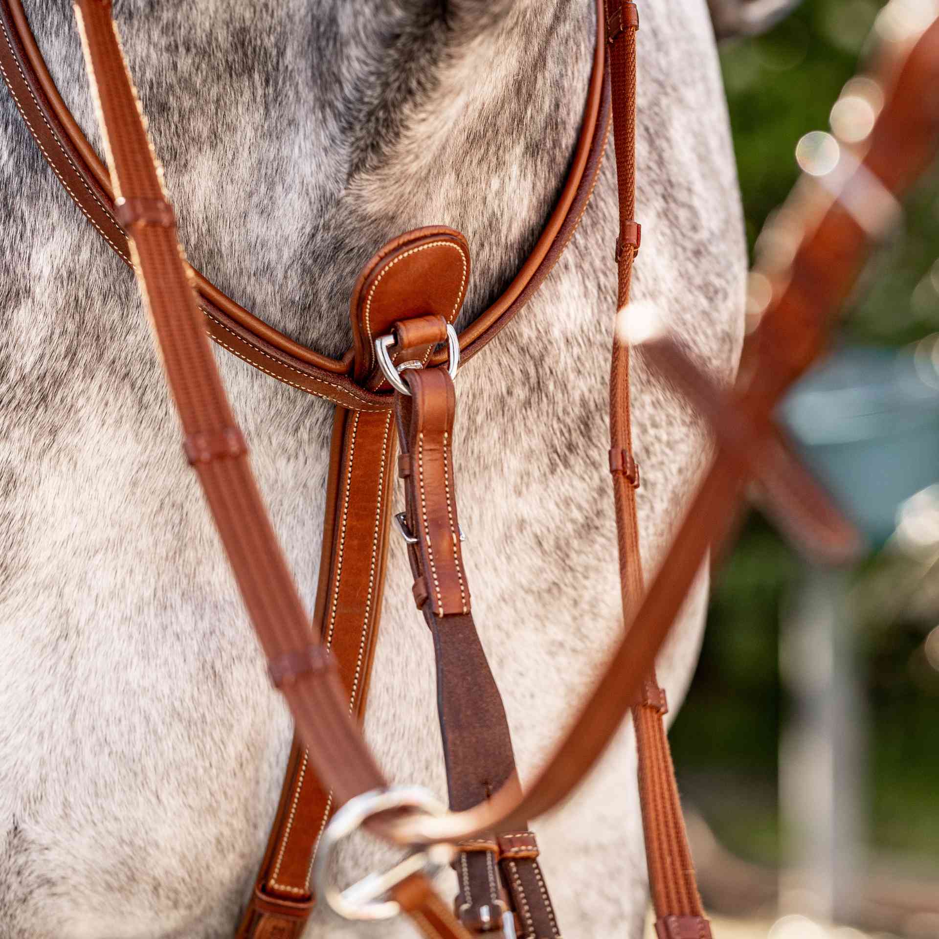 Particularly noteworthy is the manufacture from high-quality American leather, which is known for its exceptionally high quality and soft feel. This leather is mostly vegetable-tanned, ensuring sustainable production and long-lasting durability. The martingale fits comfortably against the horse's coat and stands out with its high-quality stainless steel fittings.
