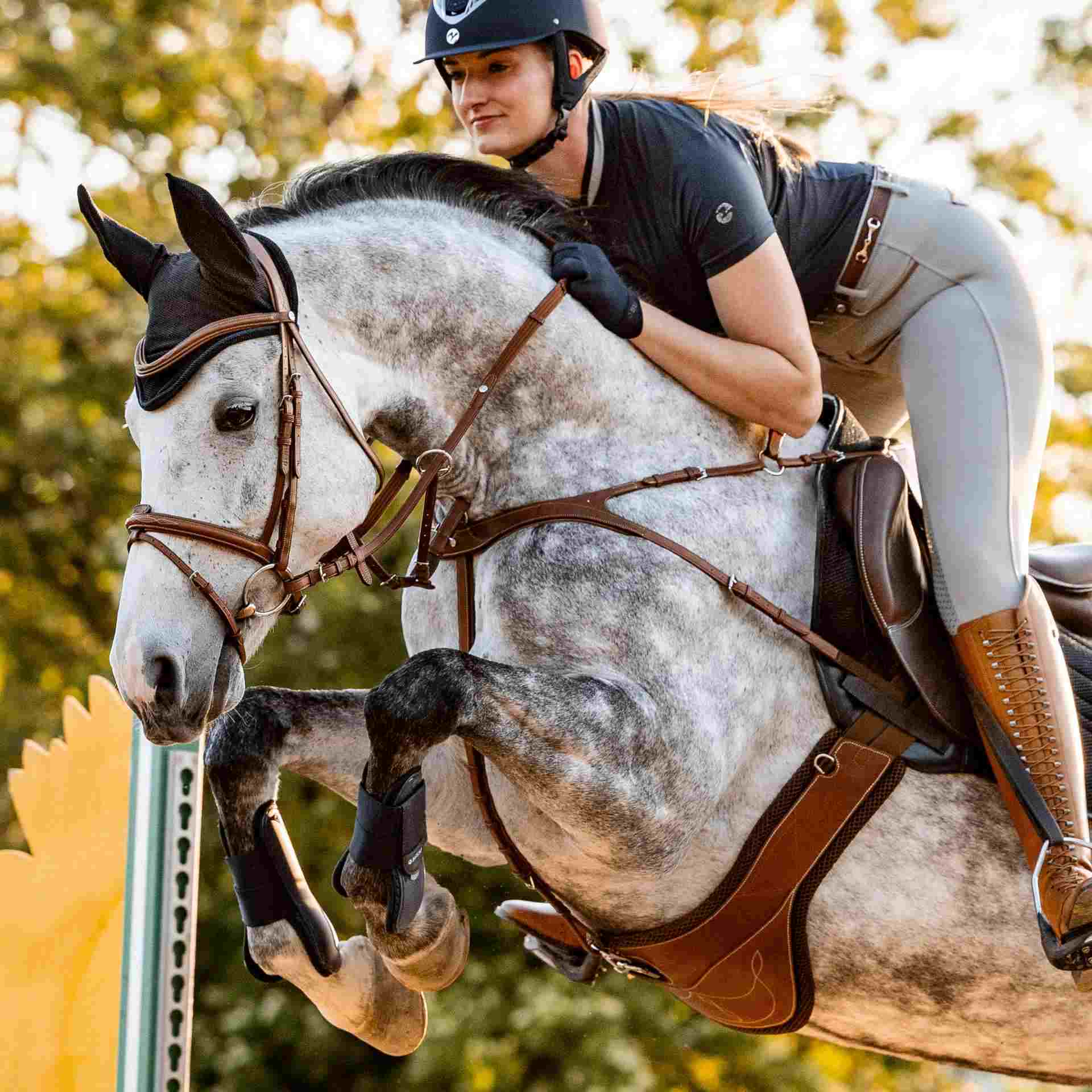 The BUSSE Breastplate TAKE-OFF LINE AP elevates your riding experience to a new level. Its anatomical cut ensures optimized shoulder movement for the horse and reliably prevents the saddle from slipping back, especially during jumping. The special, round snap hooks on the martingale fork allow you to attach the reins quickly without having to open them or guide them over the horse's head. The contrast-colored stitching conveys timeless style and sporty passion.