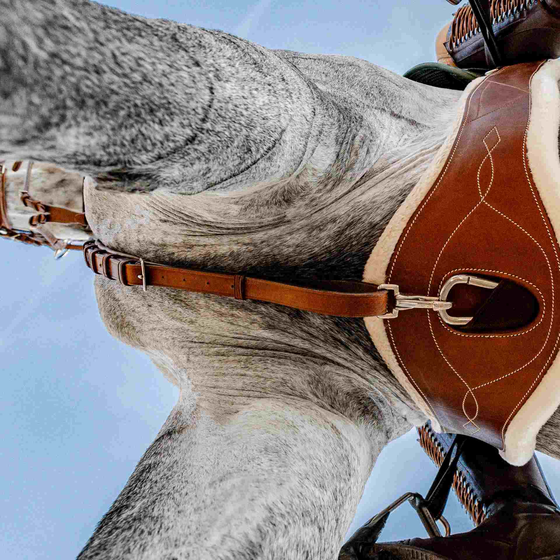 Made from the finest American leather, this breastplate is characterized by its soft feel and high quality. It is particularly supple and lies comfortably on the horse's coat. The durable leather is predominantly vegetable-tanned, making it a sustainable choice for conscientious riders. The adjustable, softly padded bridge and the five attachment points provide additional comfort and safety. The high-quality stainless steel fittings and the D-ring add further accents of perfection.