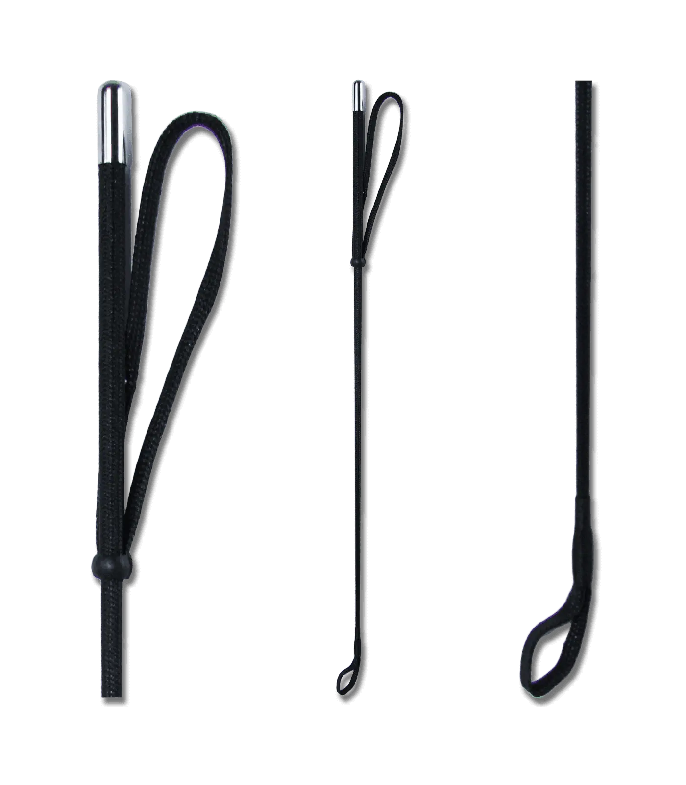Whip covered with coloured nylon and wrist loop. Handle with metal cap.
