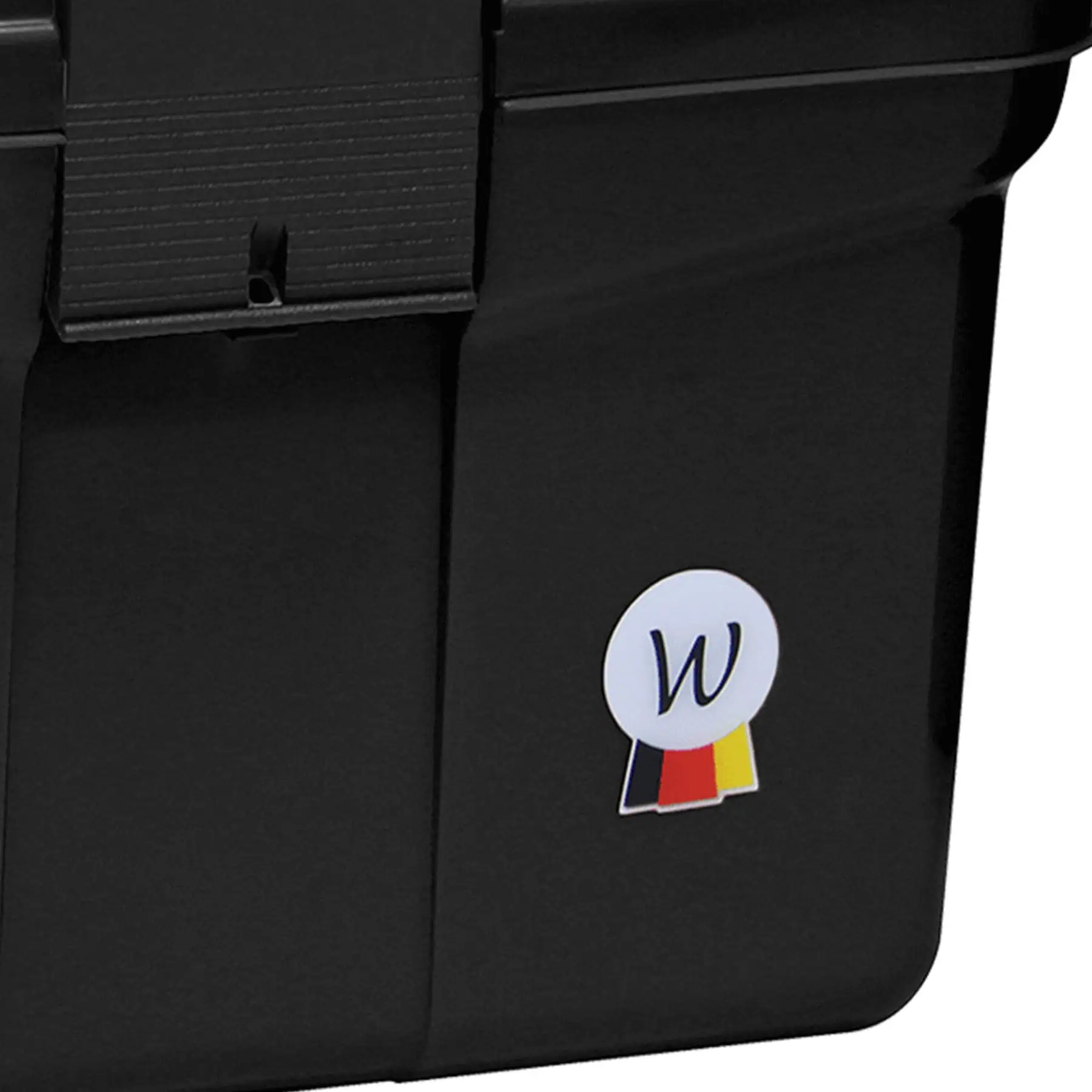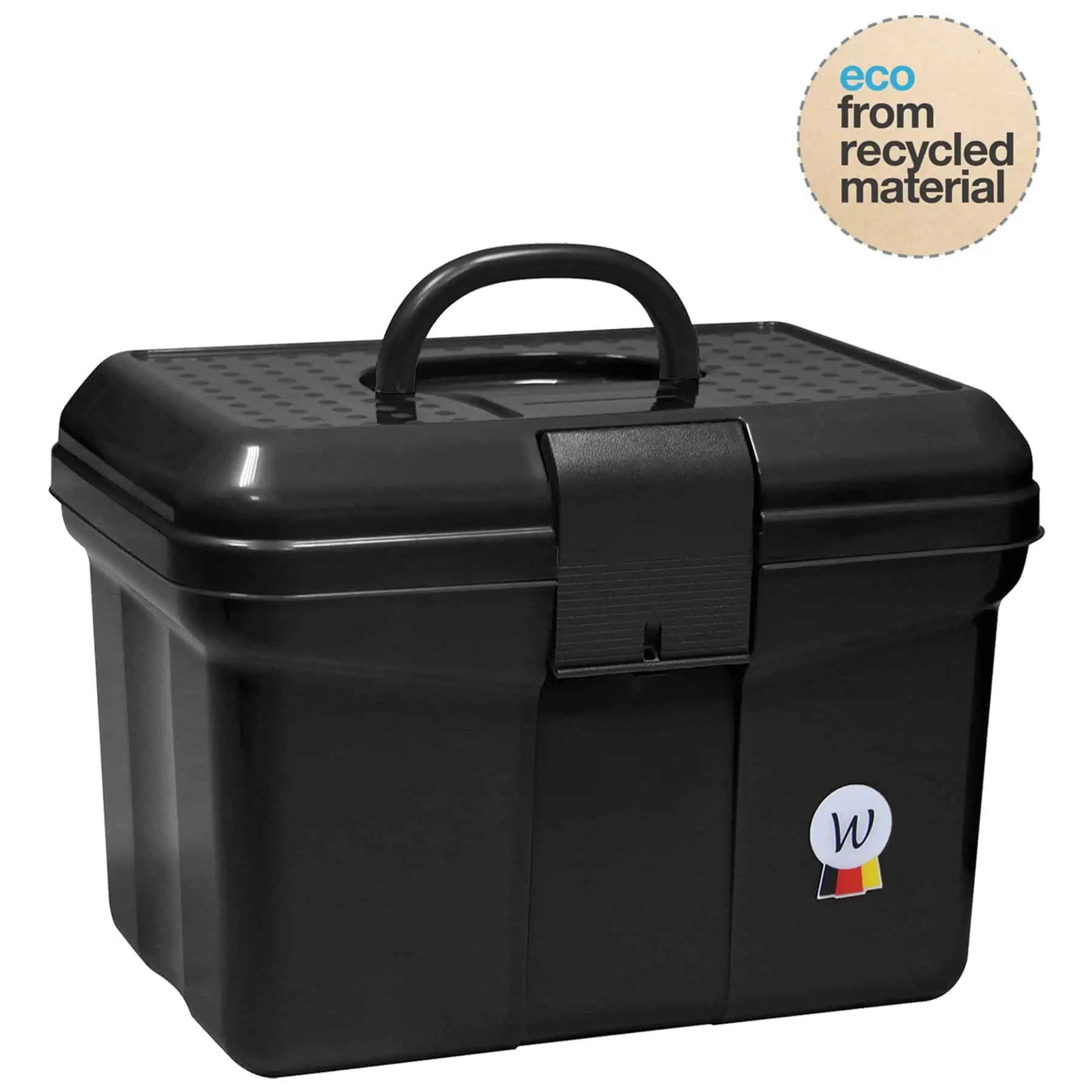 High quality grooming box in recycled plastic. The perfect companion in the stable and at competitions. Retractable handle, closable snap fastening, doubly adjustable partition, removable small parts compartment and its light weight make it stand out!