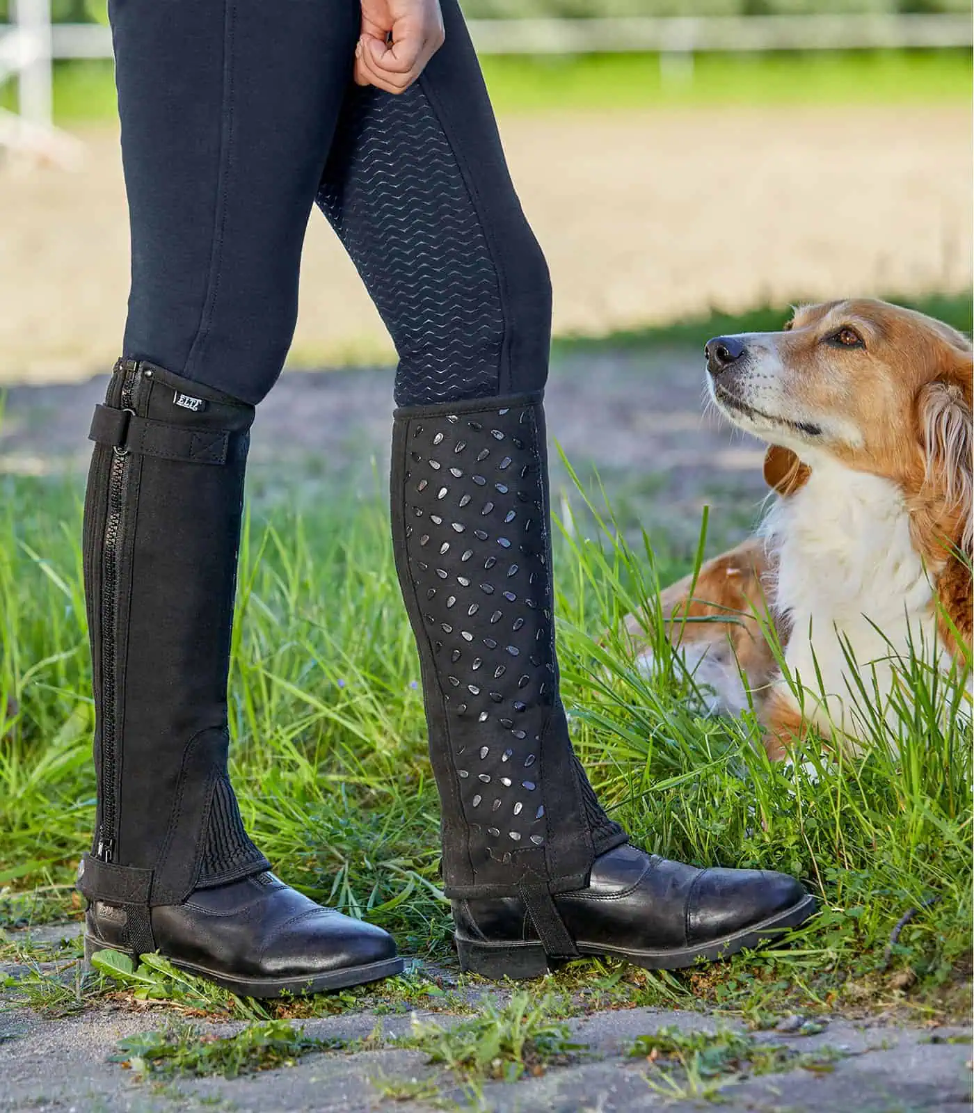 Elastic mini chaps with silicone grip.