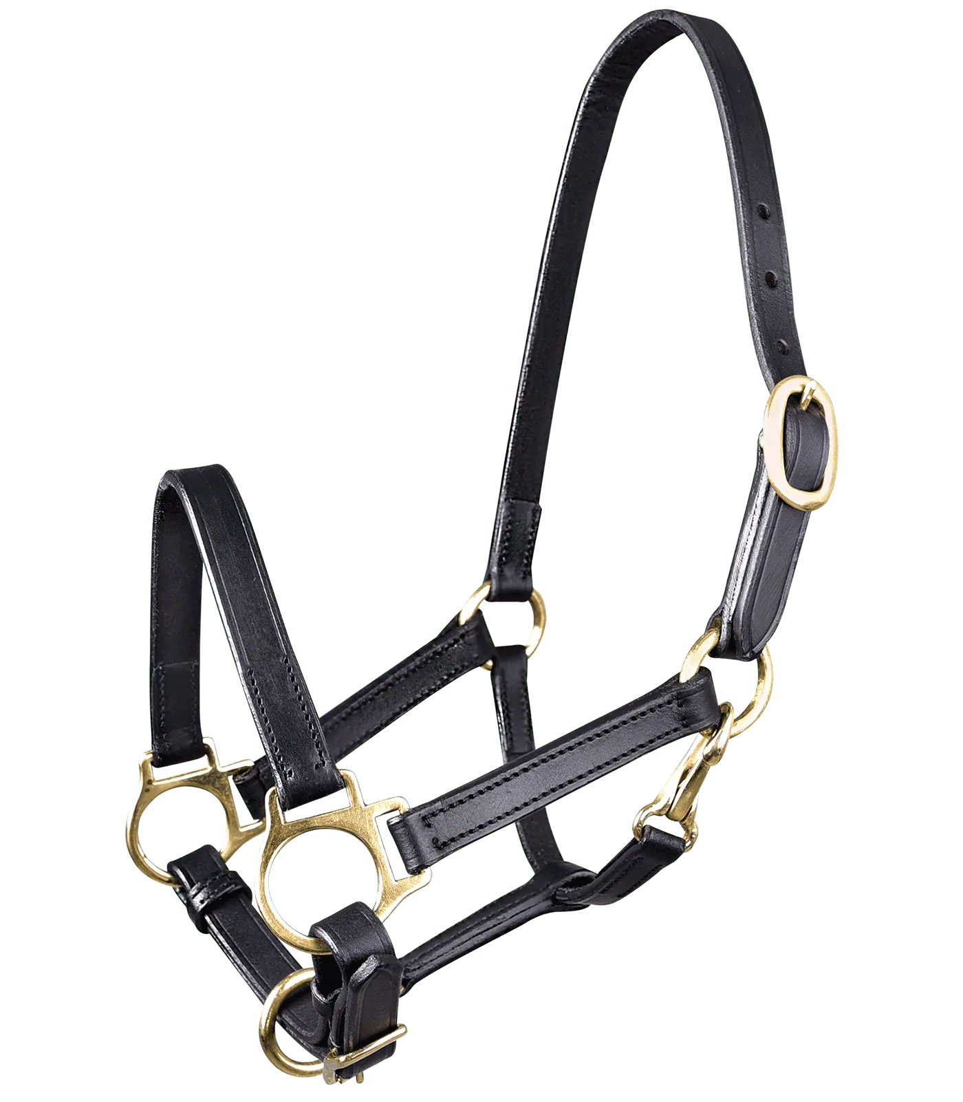 Hățâș robust din piele pentru mânji, cu accesorii aurii. Reglabil în mai multe puncte la cap și la bărbie.