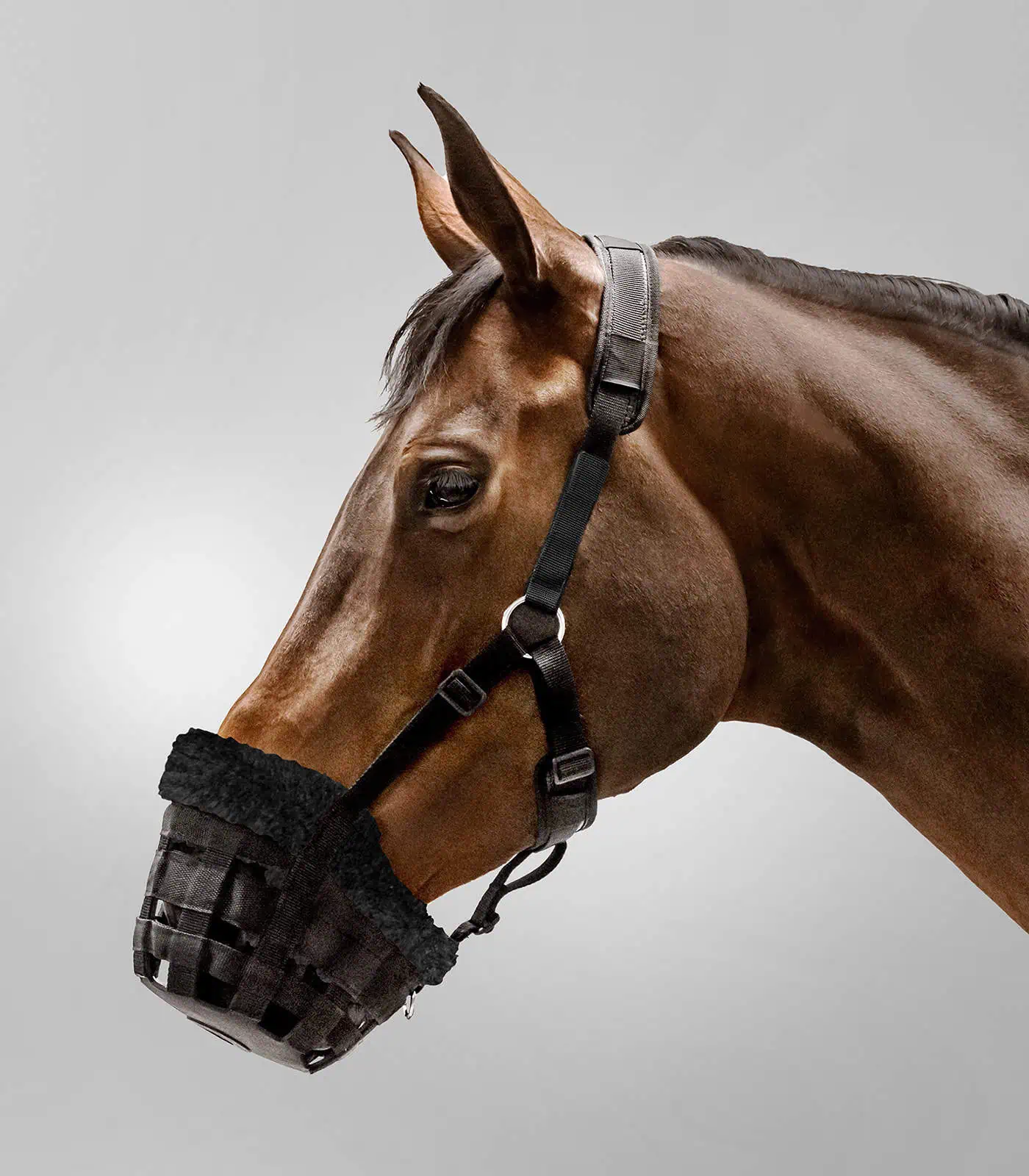 The muzzle with teddy fleece prevents your horse from excess consumption of grass or helps in the event of illness. The teddy fleece protects the sensitivity nose area as well as the back of the neck. The headpiece is secured with touch tape fastener so that there is no danger of being hooked up. For individual adjustment, the muzzle is seamlessly adjustable at the head piece. With ring for lead rope.
