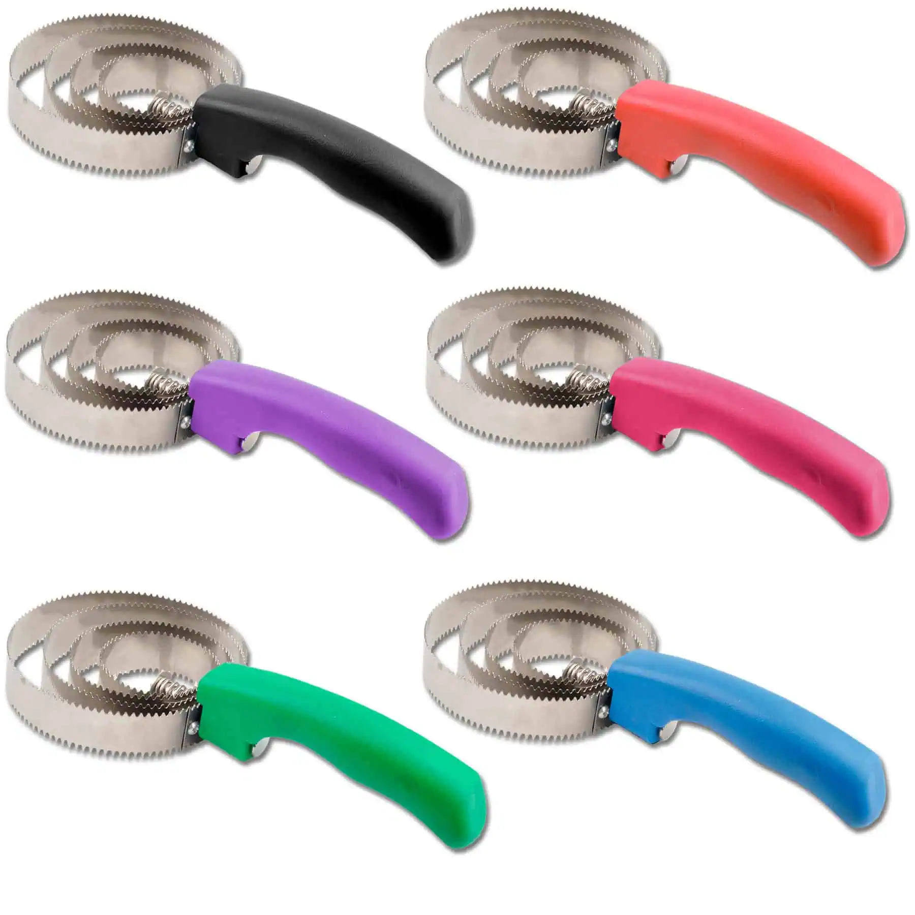 Features 4 stainless steel rings in two different strengths. Ideal for use during the horse"s change of coat or for brushing clotted coat. Plastic handle.