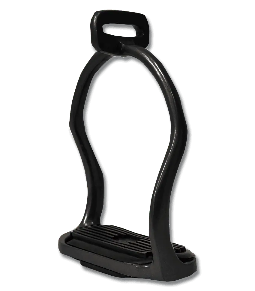 Curved shanks with eye for stirrup leather at 90°. Black tread inserts, pair.