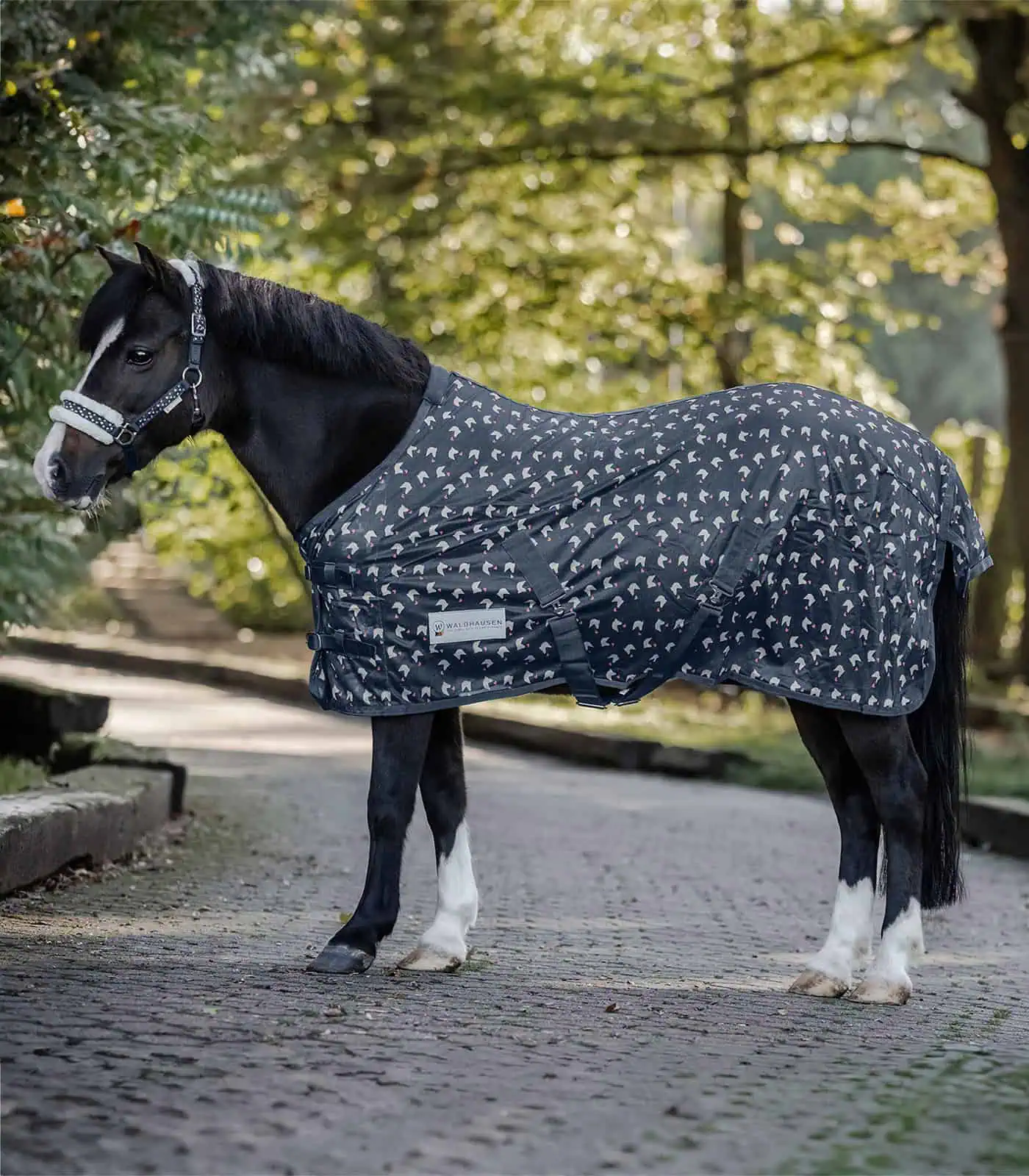 Lightweight fly rug with sweet all-over print, with double front fastener, crossover straps with elastic and fillet string.