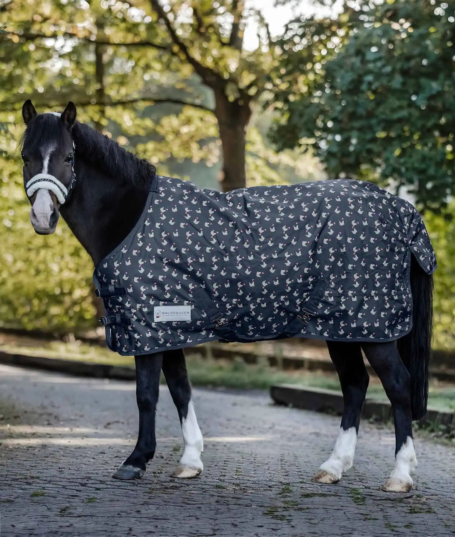 Waldhausen Patură Outdoor Lucky Fleece este o pătură outdoor impermeabilă și respirabilă, cu un imprimeu drăguț, realizată din material 600 Denier și căptușită cu fleece. Beneficiază de o închidere dublă la piept, curele încrucișate, bucle pentru funii de picior și un cordon integrat pentru coadă. Se potrivește perfect cu toate articolele din seria Waldhausen Lucky.