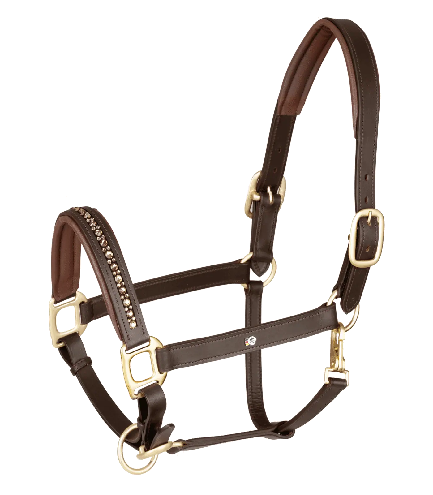 Elegant leather halter with softly padded noseband and headpiece. With decorative rhinestones on the noseband. Headpiece adjustable on both sides and easily adjustable chin strap.