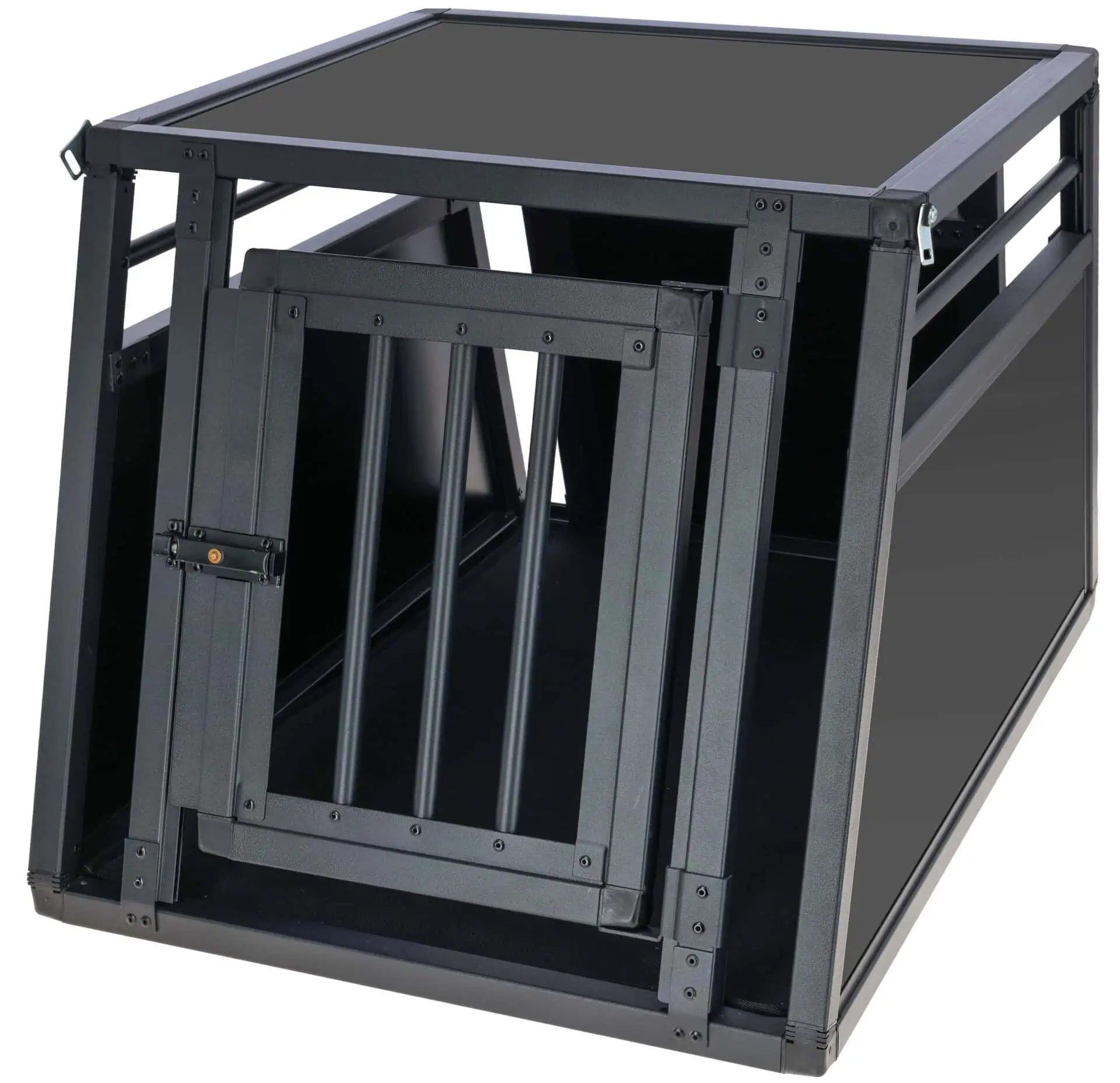 Additionally, aluminum bars in the door and upper area ensure excellent air circulation and visibility. An anti-slip thermal mat made of synthetic rubber inside provides extra comfort. The box features a door with a quick-lock system as well as smooth surfaces that allow for easy cleaning. The easy and quick assembly makes the Aluminium Transport Box Vacation particularly user-friendly.