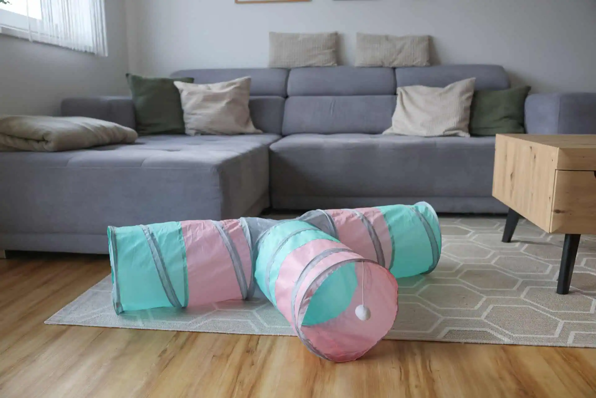 The Cat Tunnel Triangle is made from durable material that is long-lasting and safe for your cat. The sewn-in spiral spring ensures the tunnel's shape remains stable, while the crinkling material provides additional play incentives. This tunnel is particularly ideal for active cats that love to play and hunt. It is also perfect for households with multiple cats, as several cats can play through the various entrances simultaneously. The compact storage option makes it especially convenient, as it can be easily stowed away after playtime.