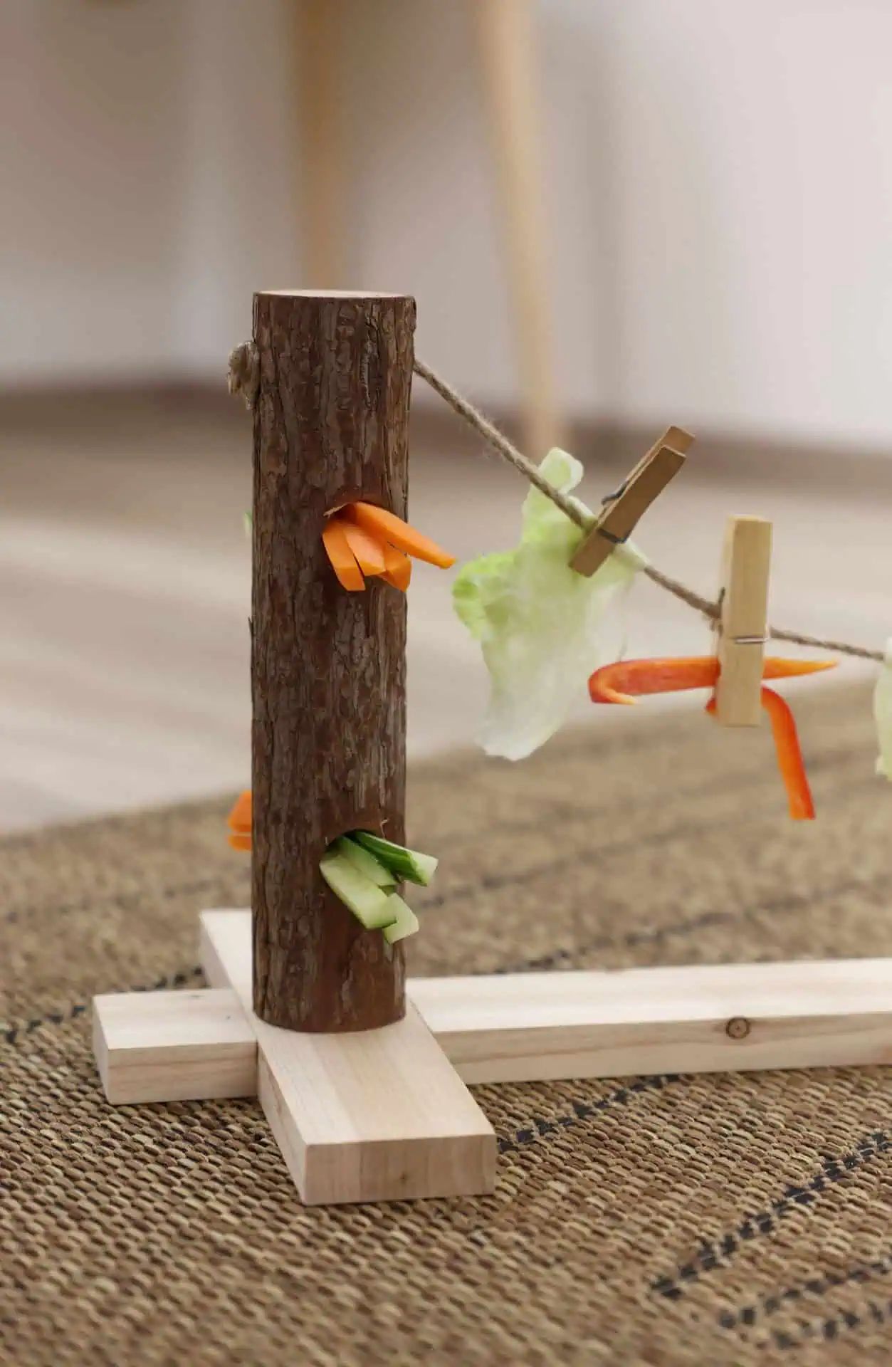 Kerbl Pet Leasha pentru rozătoare asigură o hrănire jucăușă și lentă, care promovează o digestie sănătoasă. Datorită 5 cleme pe care se pot fixa legume, lesa devine o excelentă ocupație împotriva plictiselii. Găurile pentru hrană de pe tulpinile laterale pot fi umplute cu alte bunătăți, ceea ce face lesa foarte versatilă. Cu picioarele robuste din lemn, oferă o stabilitate excelentă și poate fi folosită atât în interior, cât și în exterior.